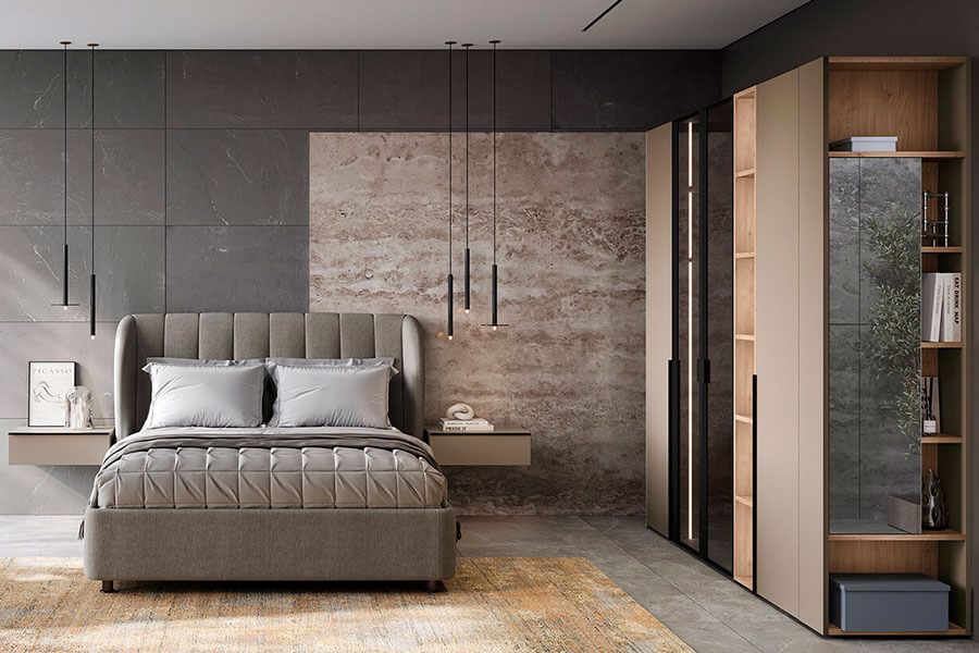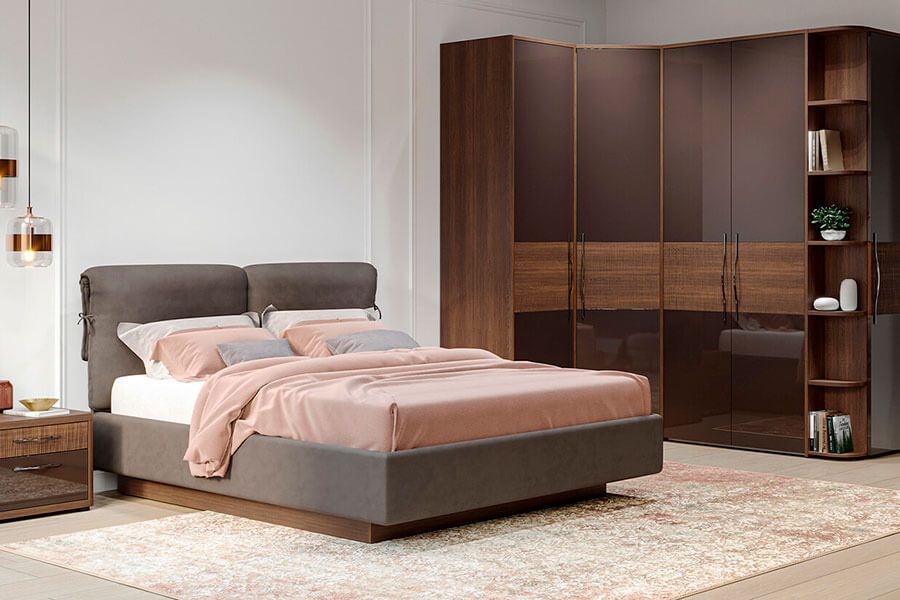 Чтобы придать интерьеру глубину, можно выбрать платяные шкафы со стеклянными тонированными фасадами вместо сплошных и добавить секции открытого хранения с полками для стильных аксессуаров.