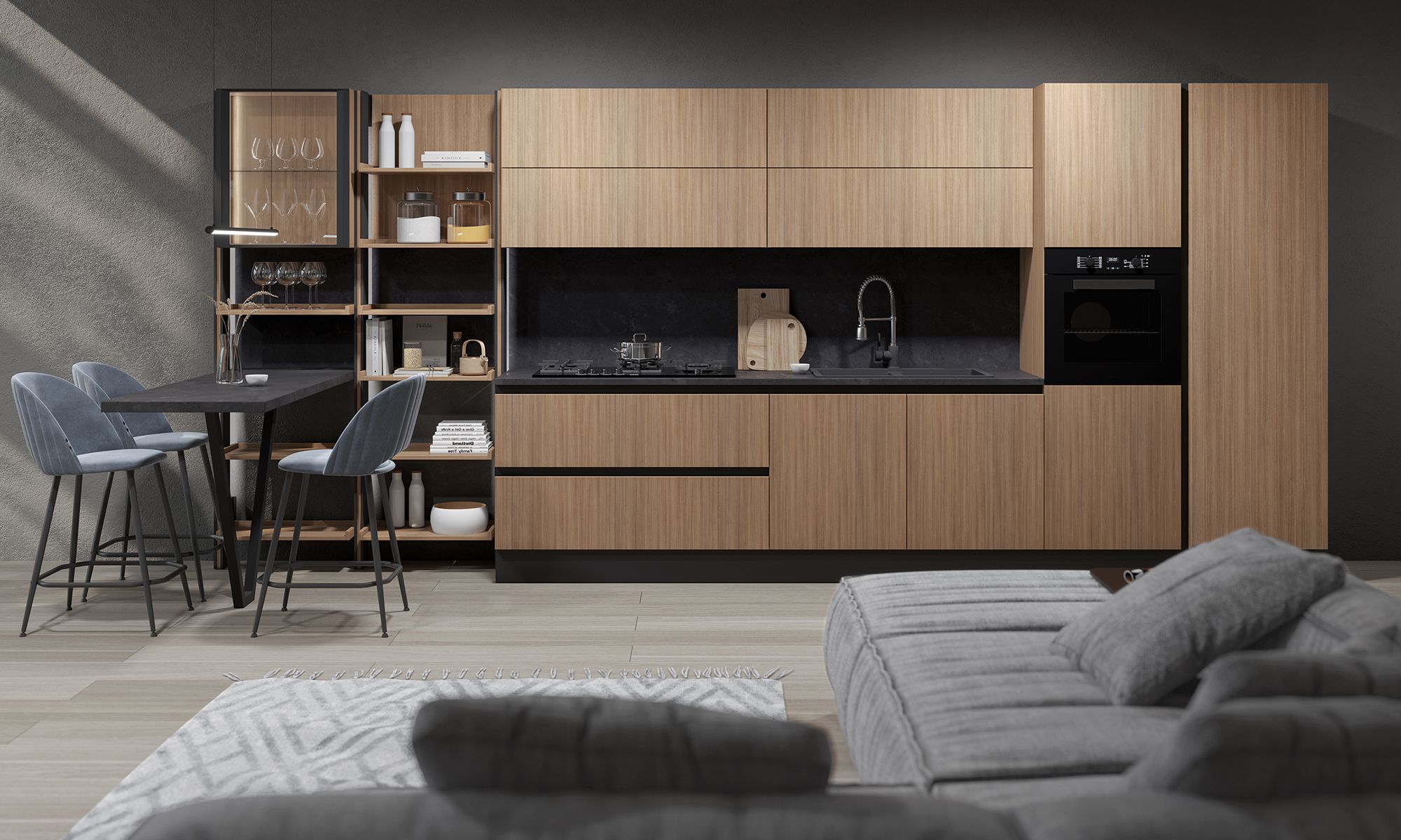 В первую очередь, шпон древесных пород. Такая отделка придает кухне особую респектабельность и не теряет свою привлекательность со временем. Также часто используются современные аналоги, которые более устойчивы к агрессивной кухонной среде. Такие материалы с текстурами дерева и камня практически неотличимы от природных как визуально, так и на ощупь, но гораздо практичнее в уходе – легко моются, менее чувствительны к перепадам влажности и температур, не выцветают от воздействия ультрафиолета.