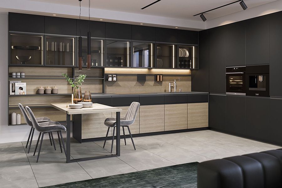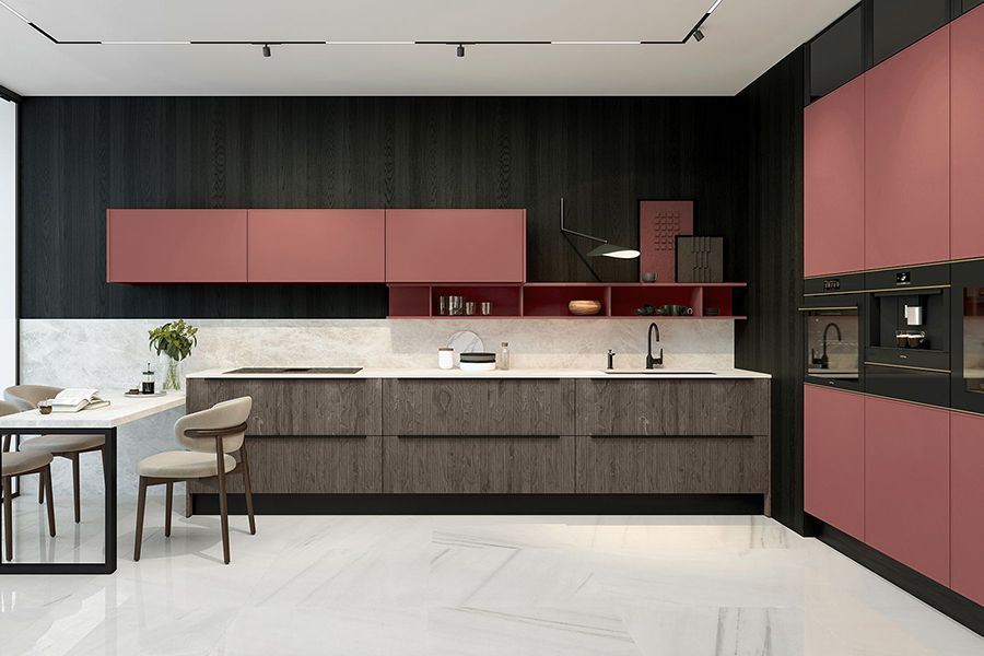 Дизайнеры советуют сочетать не более трех оттенков. Например, основа с текстурой дуба, матовые фасады под бетон и черные рамы шкафов. Или фасады в отделке шпоном, открытые полки в эмали ягодного оттенка и светлая столешница и стеновая панель.