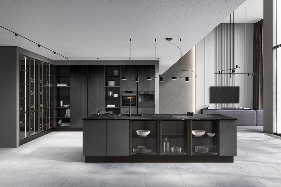 Кухня MALBEC c островом, на котором располагается рабочая зона с мойкой и варочной поверхностью. Угловая композиция со шкафами-колоннами до потолка не выглядит громоздкой за счет модулей с открытыми полками и шкафов-витрин со стеклом, оснащенных встроенной подсветкой. Часть системы хранения отведена под коллекцию вин – они хранятся в шкафах с наклонными полками. Монохромное решение композиции реализовано сочетанием шпона с металлизированным покрытием Iron Wood и гладкой текстуры Iron.