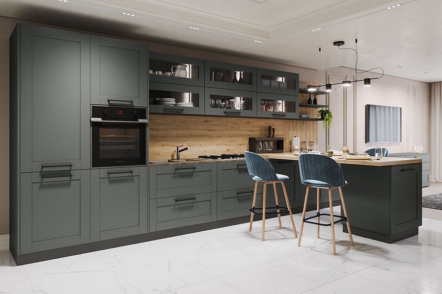 Угловая кухня TERRA c островом. Интерьер представляет собой микс неоклассических и современных элементов. Фасады графитового оттенка с традиционной рамкой и металлическими ручками-скобами скомбинированы со столешницей и фартуком в текстуре Каштан Кентукки песочный. Приоритетом при проектировании являлись вместительные системы хранения. Угол кухни образован барной стойкой. Она позволила компенсировать малую площадь рабочей поверхности. Стойка опирается на вместительную тумбу – дополнительное место для хранения. Навесные шкафы-витрины с откидными фасадами оборудованы внутренней подсветкой. Справа – открытые полки для аксессуаров, которые визуально оформляют переход от кухни к зоне гостиной.