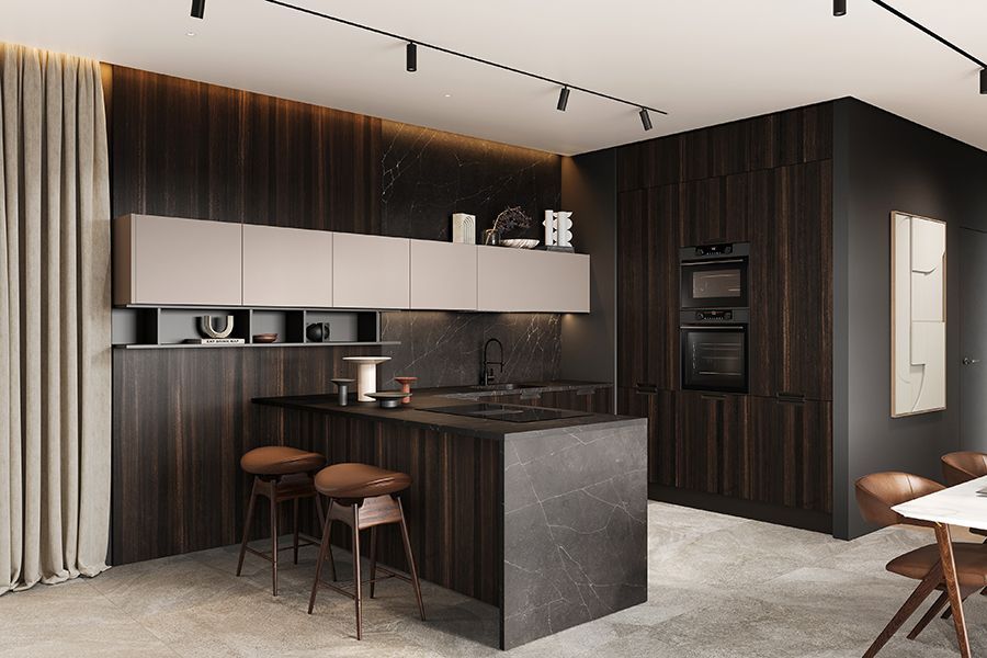 Светлые vs темные оттенки. Светлая палитра (белый, кремовый, светло-серый) визуально расширяет пространство, что полезно для небольших помещений. Темные цвета (графит, текстура дерева, глубокий синий) добавляют камерности и уюта, но требуют яркого освещения.Визуальное расширение пространства. Чтобы сделать кухню зрительно больше, используйте прием цветового контраста: светлые матовые фасады верхних шкафов и темные — нижних. Скорректировать геометрию поможет светлый фон фасадов для композиции по одной стене и тёмный – для другой.