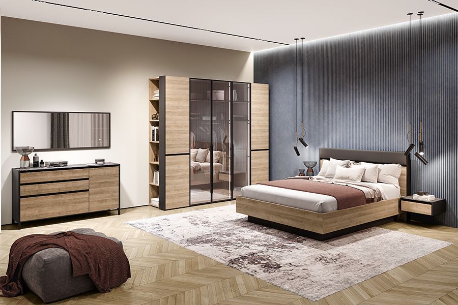 Центральный элемент – кровать. Популярны модели в мягком текстильном корпусе с высоким изголовьем. Прикроватные тумбы – как традиционной конструкции, так и навесные. Последние смотрятся более легкими и не перегружают интерьер. Создавать ощущение воздушного пространства могут и вместительные платяные шкафы со стеклянными фасадами. Они обладают зеркальным эффектом при выключенном освещении и становятся полупрозрачными при включенной внутренней подсветке, придавая пространству глубину. Это трендовое решение характерно именно для современного стиля.