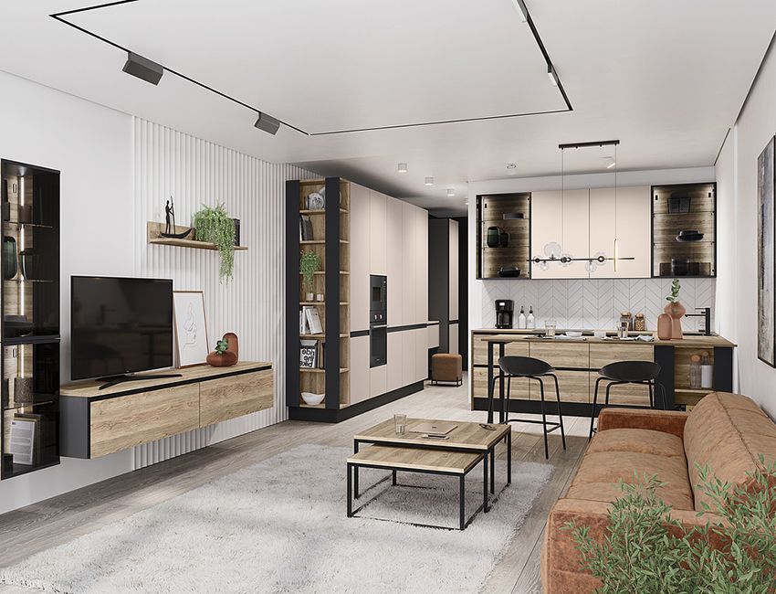 Это родственные направления, поэтому их сочетание дается легко. От сканди берется светлая палитра, обилие дерева и уютный текстиль, а от современного стиля — более строгие формы и технологичные материалы. Результат – комфортный универсальный интерьер, который легко трансформируется с помощью текстиля и аксессуаров.