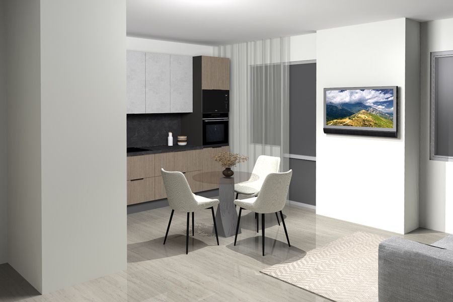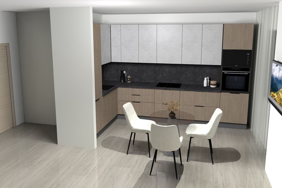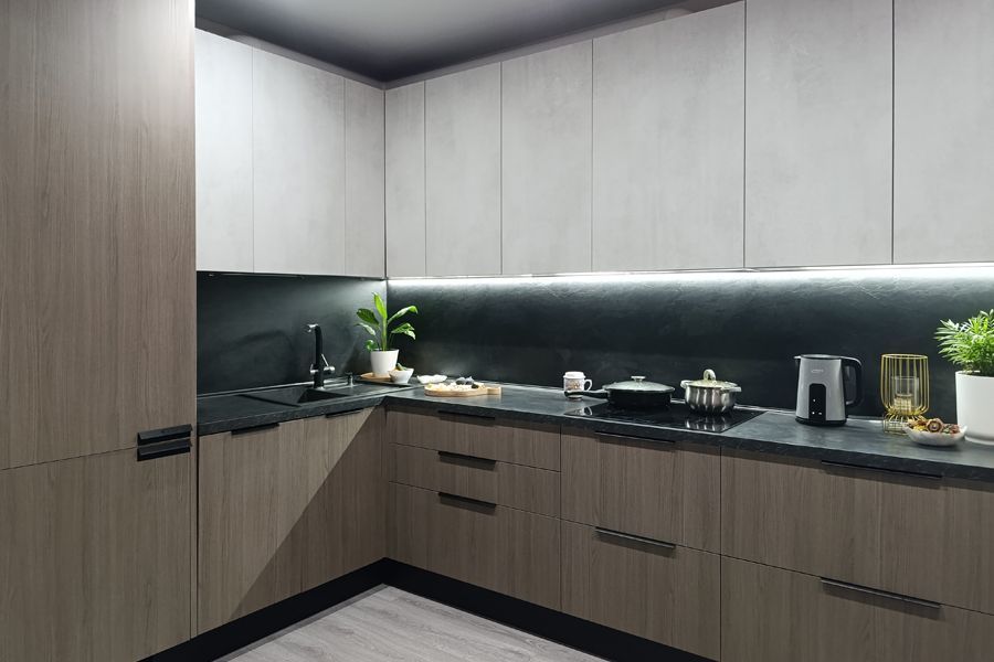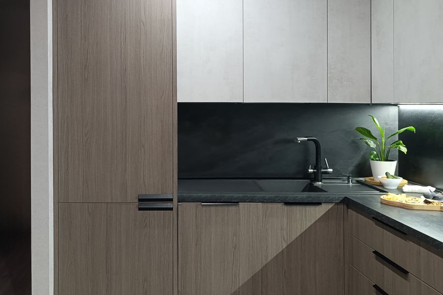 Для тумб нижнего яруса выбрали практичную отделку пластиком высокой плотности в текстуре Дуб Виченца. В качестве цвета-компаньона для навесных шкафов – текстуру Бетон светлый.