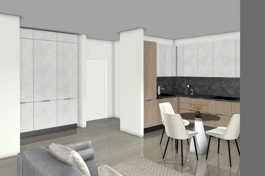 В итоге стол решили расположить отдельно (круглый в проекте для примера, а реальную обеденную зону покажем на фото). Место шкафа со стеклом заняла колонна со встроенной бытовой техникой – духовкой и микроволновой печью.