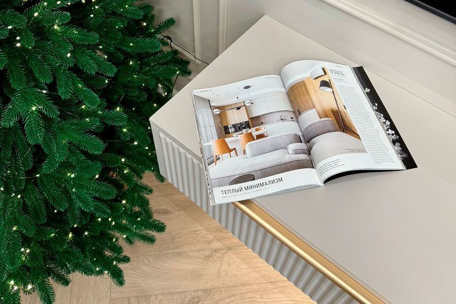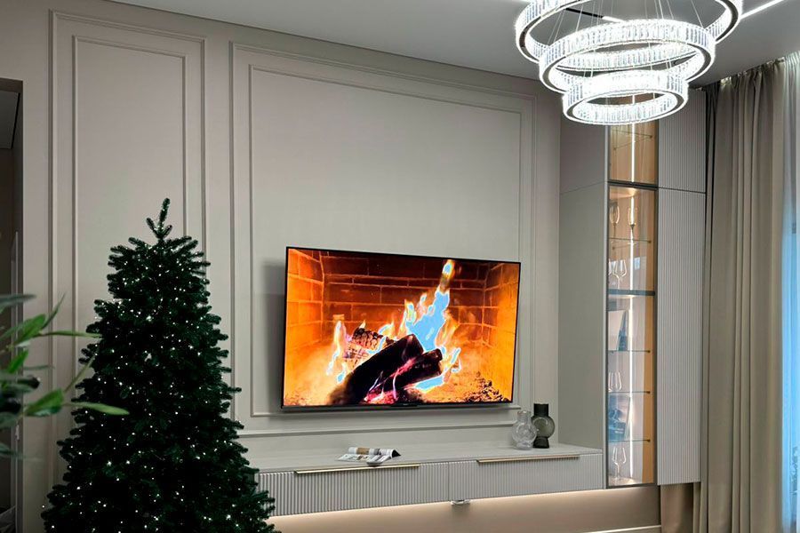 ТВ-зона образована подвесными тумбами и шкафом-витриной со встроенной подсветкой, которую можно включить с пульта. Каждый сценарий освещения создает свою особую атмосферу: от торжественной до камерной и уютной.