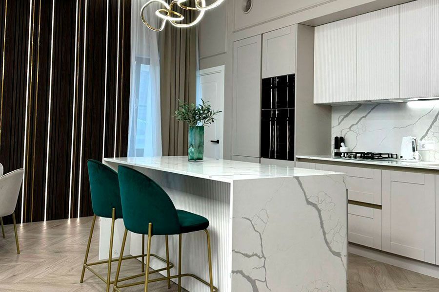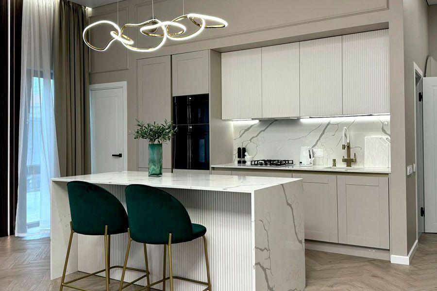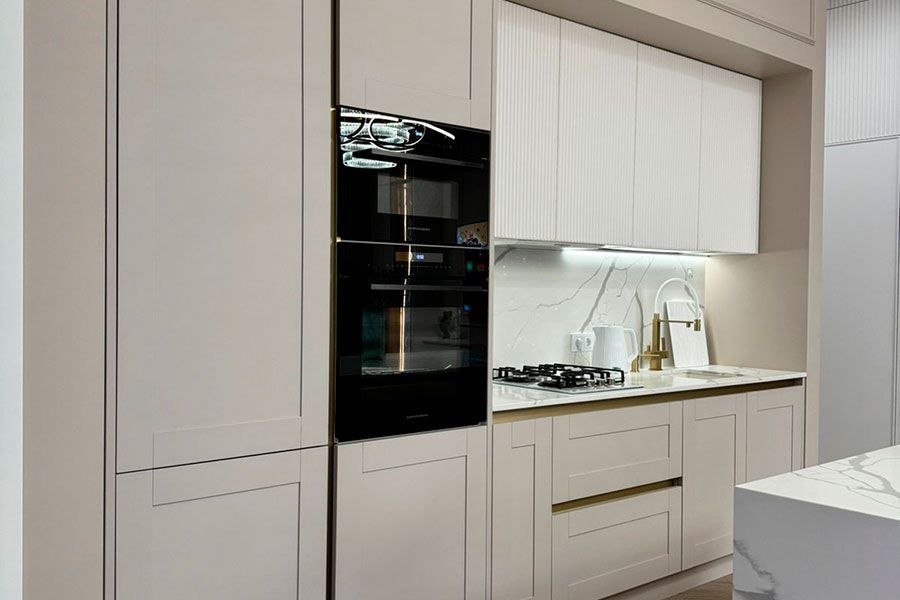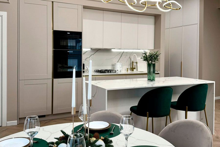 Этот интерьерный проект интересен тем, что в нем гармонично соединились неоклассические и современные элементы, несколько функциональных зон и источников освещения. Кухня с неоклассическими рамочными фасадами встроена в портал, образованный стеной, и выполнена в том же оттенке. Исключение – зона готовки. Для шкафов верхнего яруса здесь использованы белые фасады-компаньоны, декорированные вертикальным рельефом. Справа от рабочей зоны расположена колонна со встроенной техникой.