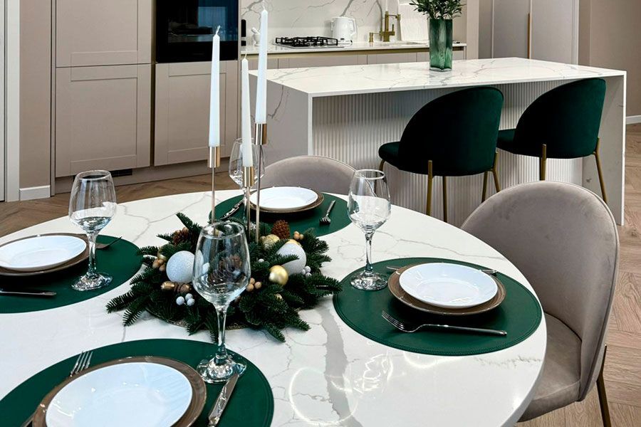 В обеденной зоне располагается круглый стол, где могут с комфортом разместиться несколько человек. В качестве акцентного цвета выбран изумрудно-зеленый, который отлично сочетается с оттенком фасадов.