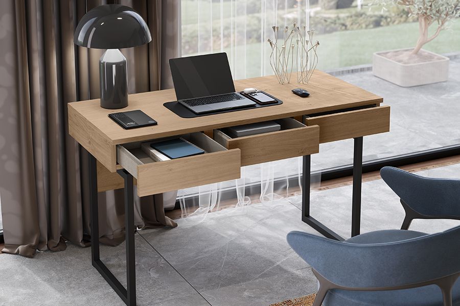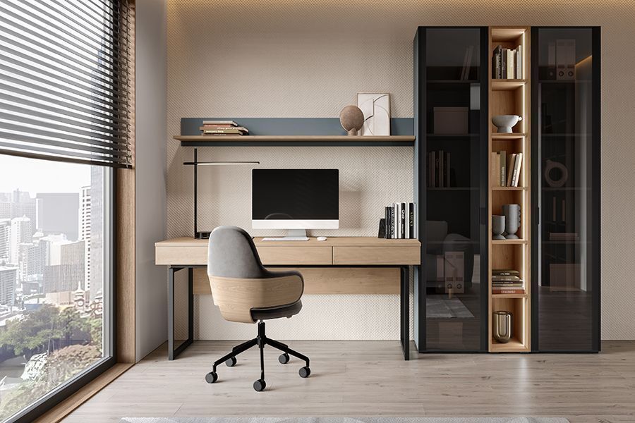 Организация зависит от количества людей, которые будут пользоваться зоной одновременно.Для одного пользователя проще. Нужны столешница длиной не менее 120 см и баланс в расположение источников хранения. Тумбу или ящики лучше разместить со стороны доминирующей руки, а навесные полки — над столом или сбоку, чтобы не загромождать вид и не создавать давящего ощущения. Письменный стол у окна в таком исполнении становится личным комфортным уголком.