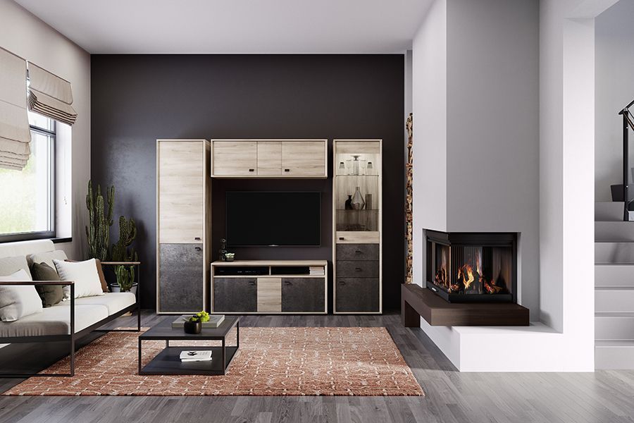 Медиа-зона: телевизор часто вешают на акцентную стену, а технику прячут в нишу или устанавливают на подвесную консоль.