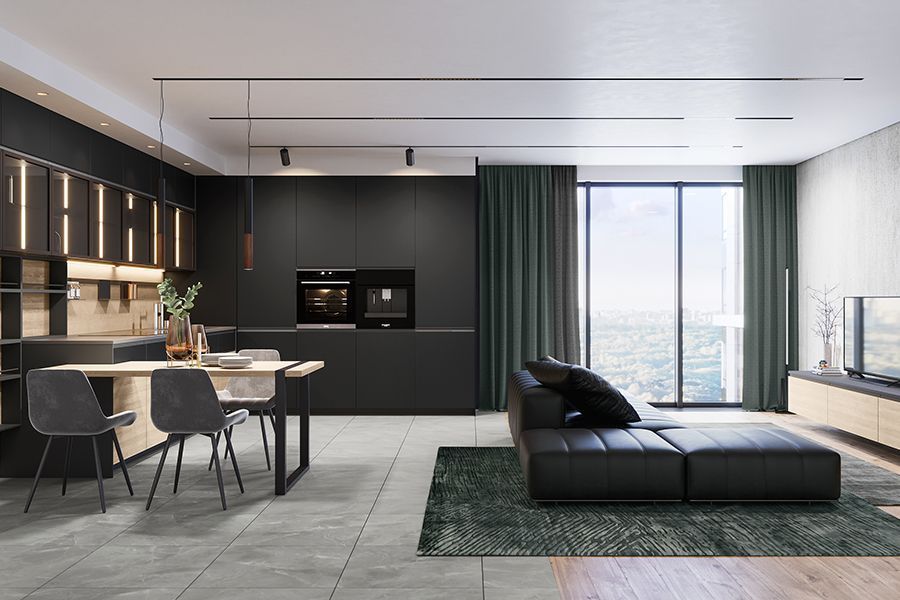 Задача — сохранить единство, но обозначить границы. Разделить зоны можно островом, напольным покрытием (плитка в кухне, дерево в гостиной), световым сценарием.