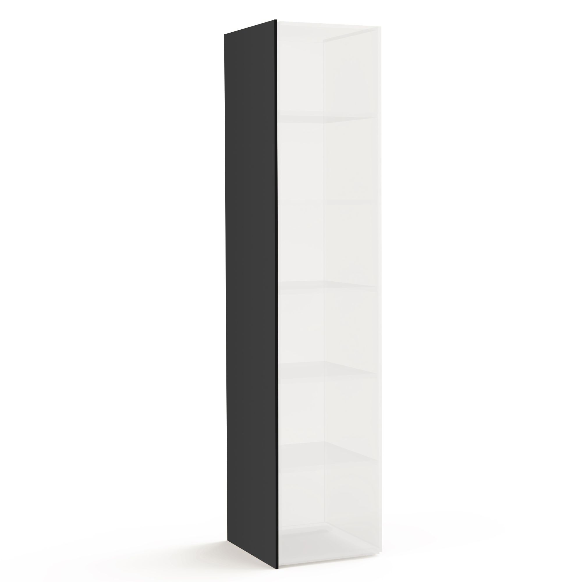 Боковая стенка BRUNO черного цвета применяется для завершения шкафных композиций, а также в качестве перегородки: между угловым и прямым шкафом либо между угловым шкафом и завершающим элементом для придания завершенного вида и графичности шкафной композиции. Стенка не устанавливается между прямыми шкафами, а также между прямым шкафом и завершающим элементом.