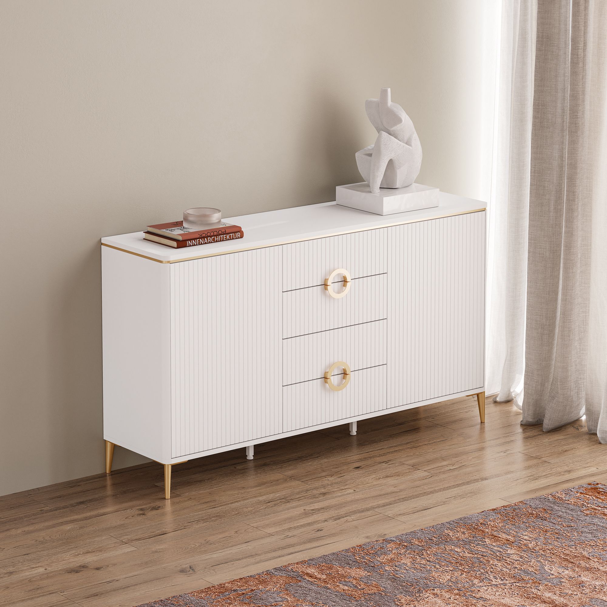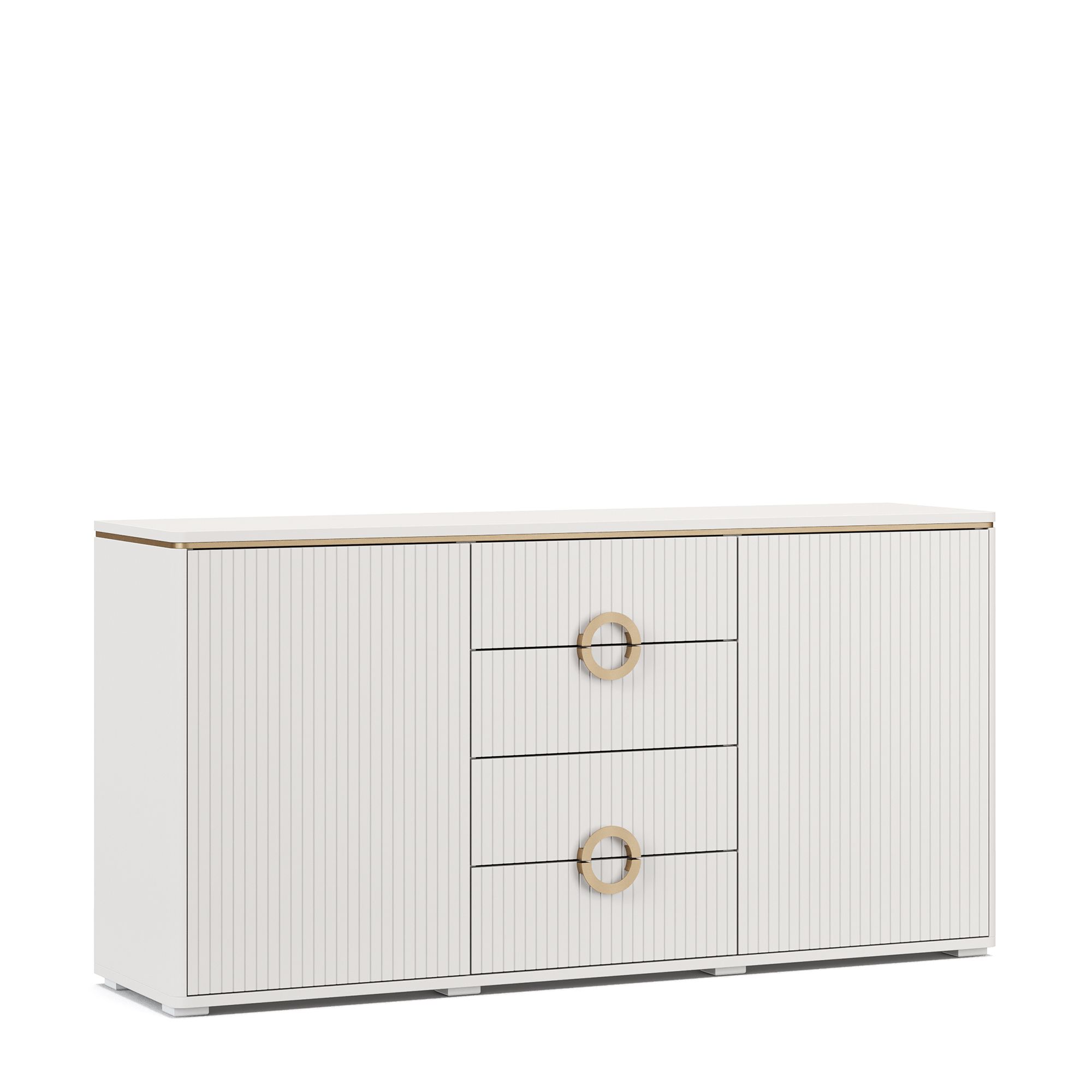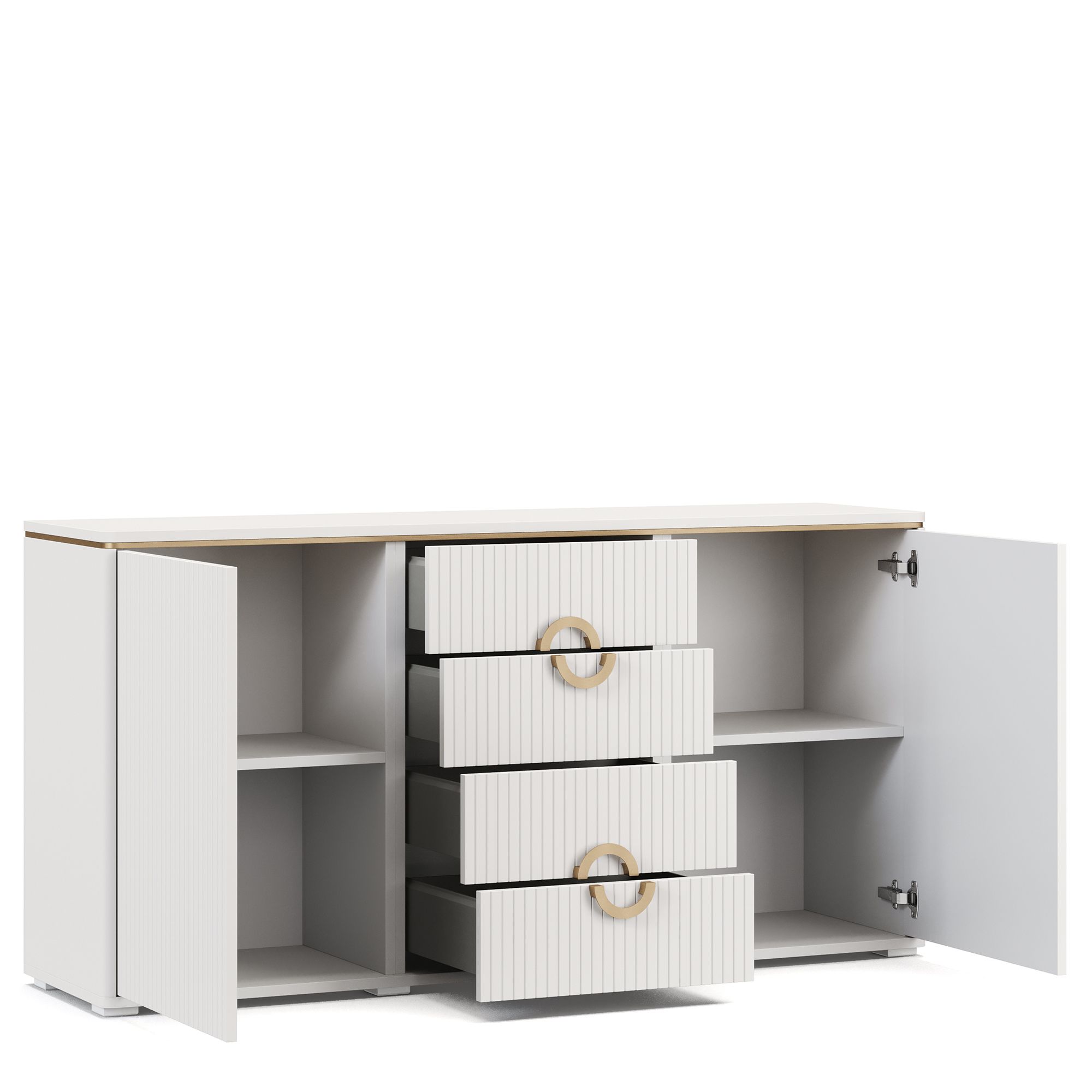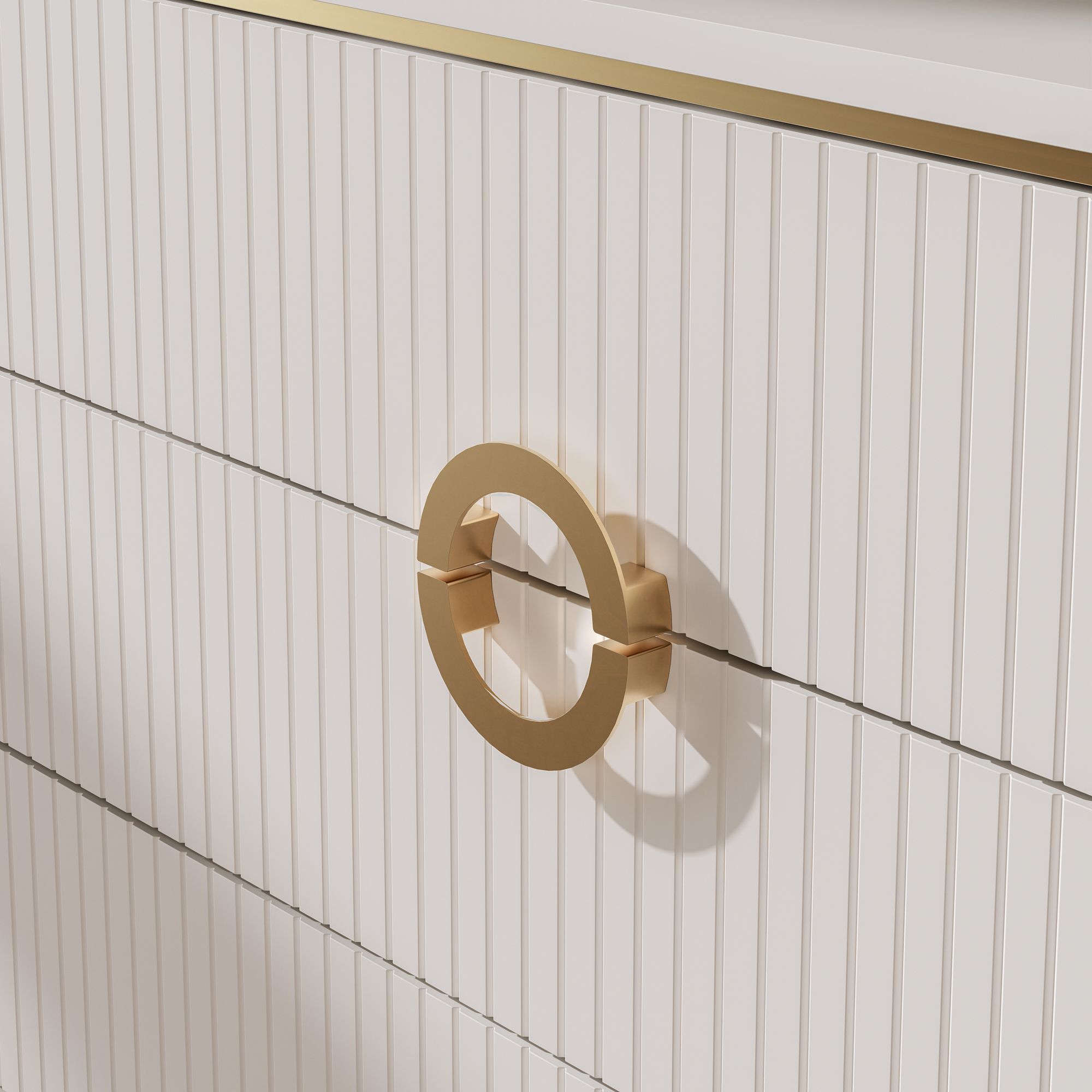 Комод TIARA оснащен четырьмя выдвижными ящиками с внутренней текстурой Шенилл, повторяющей рисунок натуральной ткани. Справа и слева расположены отделения с распашными фасадами системы Push-to-open. Фасады модели выполнены в отделке эмалью и декорированы вертикальной фрезеровкой. Выдвижные ящики оснащены ручками в отделке Матовое золото.