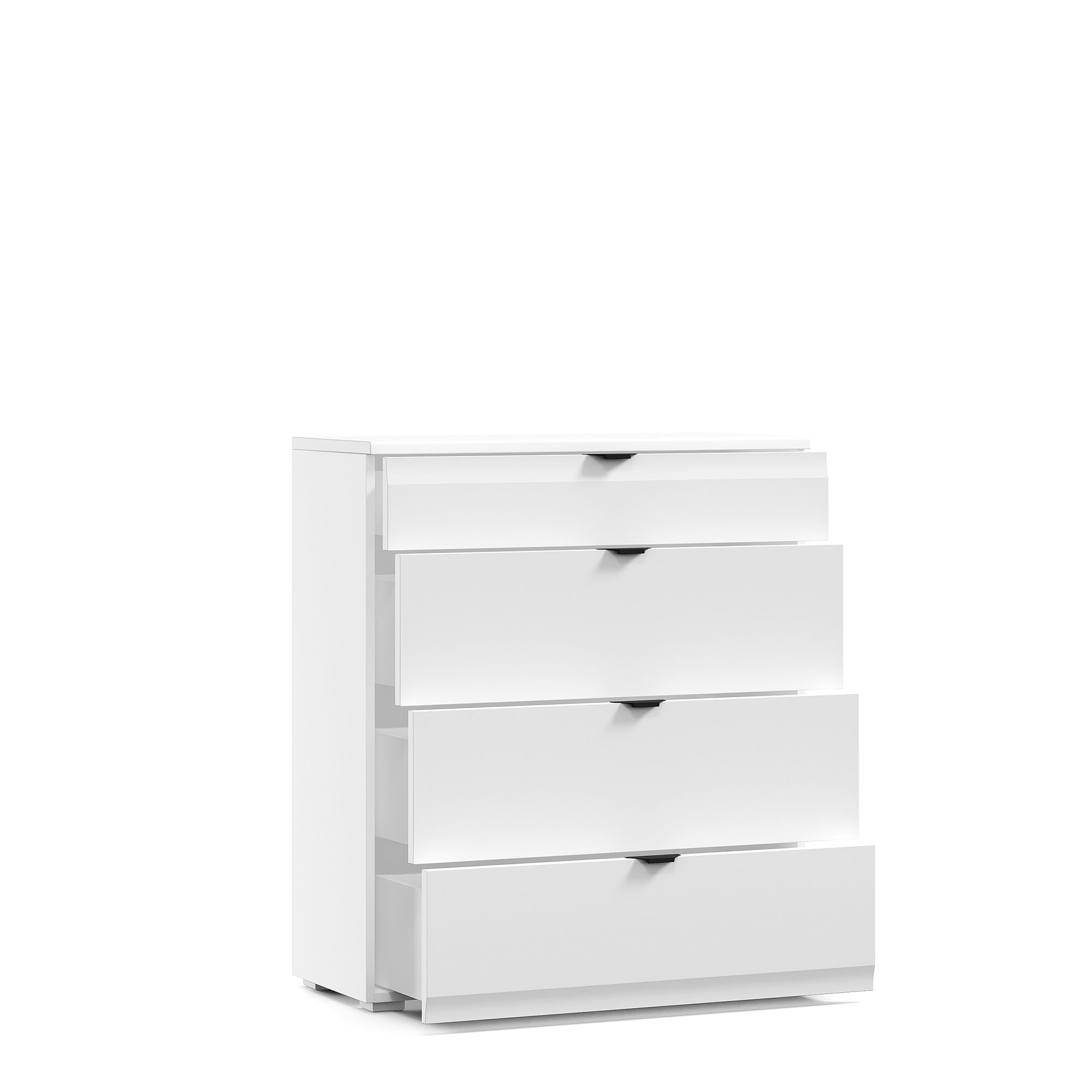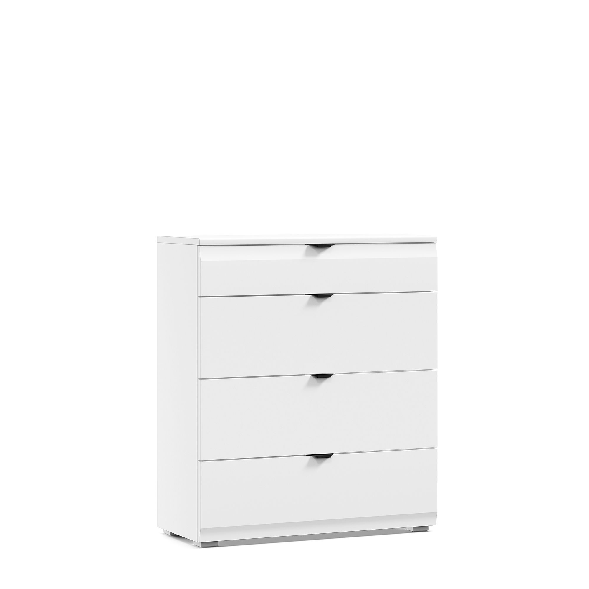 Вместительный комод Turin, оснащенный четырьмя выдвижными ящиками, может использоваться как отдельно, так и в композиции со стеллажом, который может иметь как правое, так и левое исполнение. На выбор предлагается несколько вариантов ручек и опор, благодаря чему можно придать мебели индивидуальный стиль.