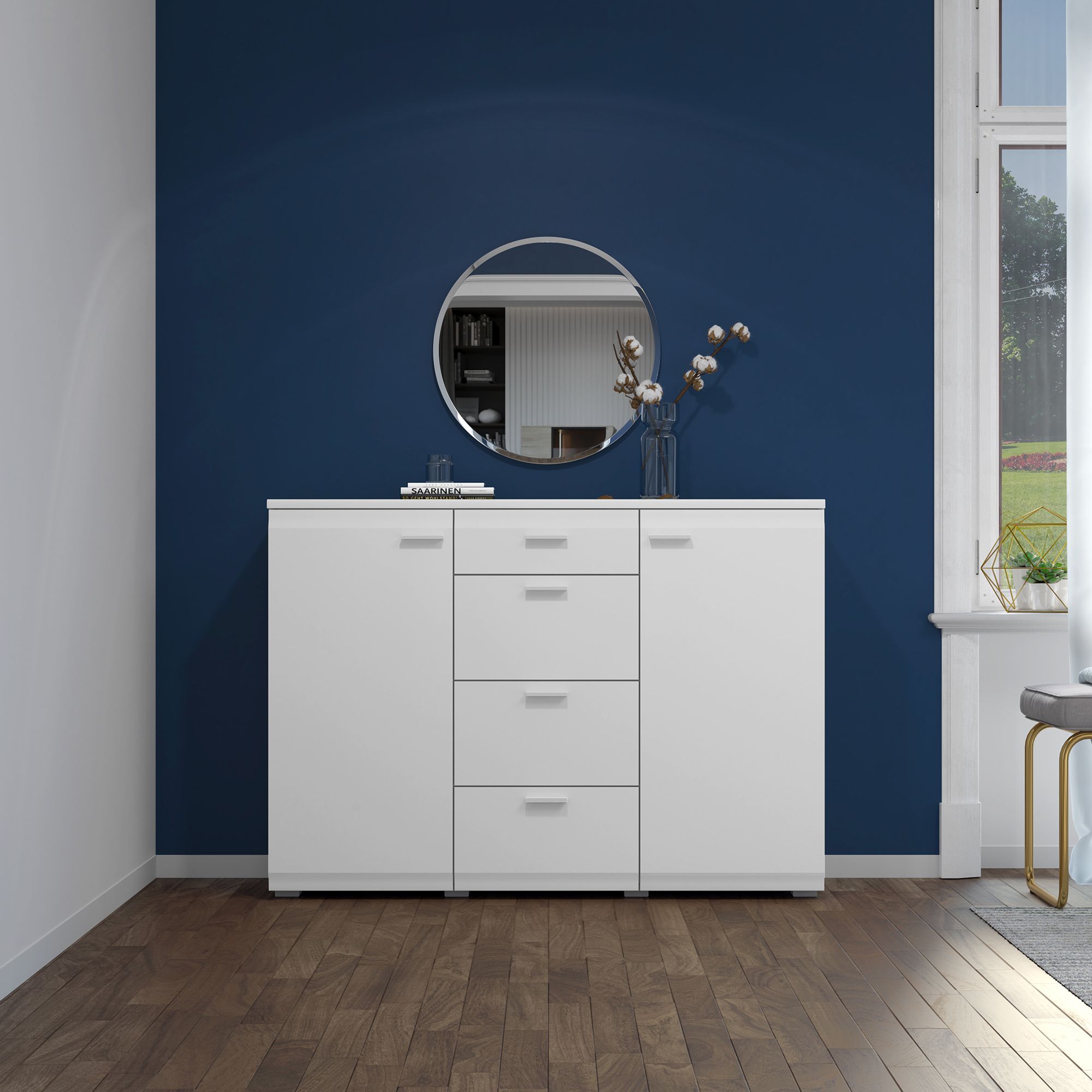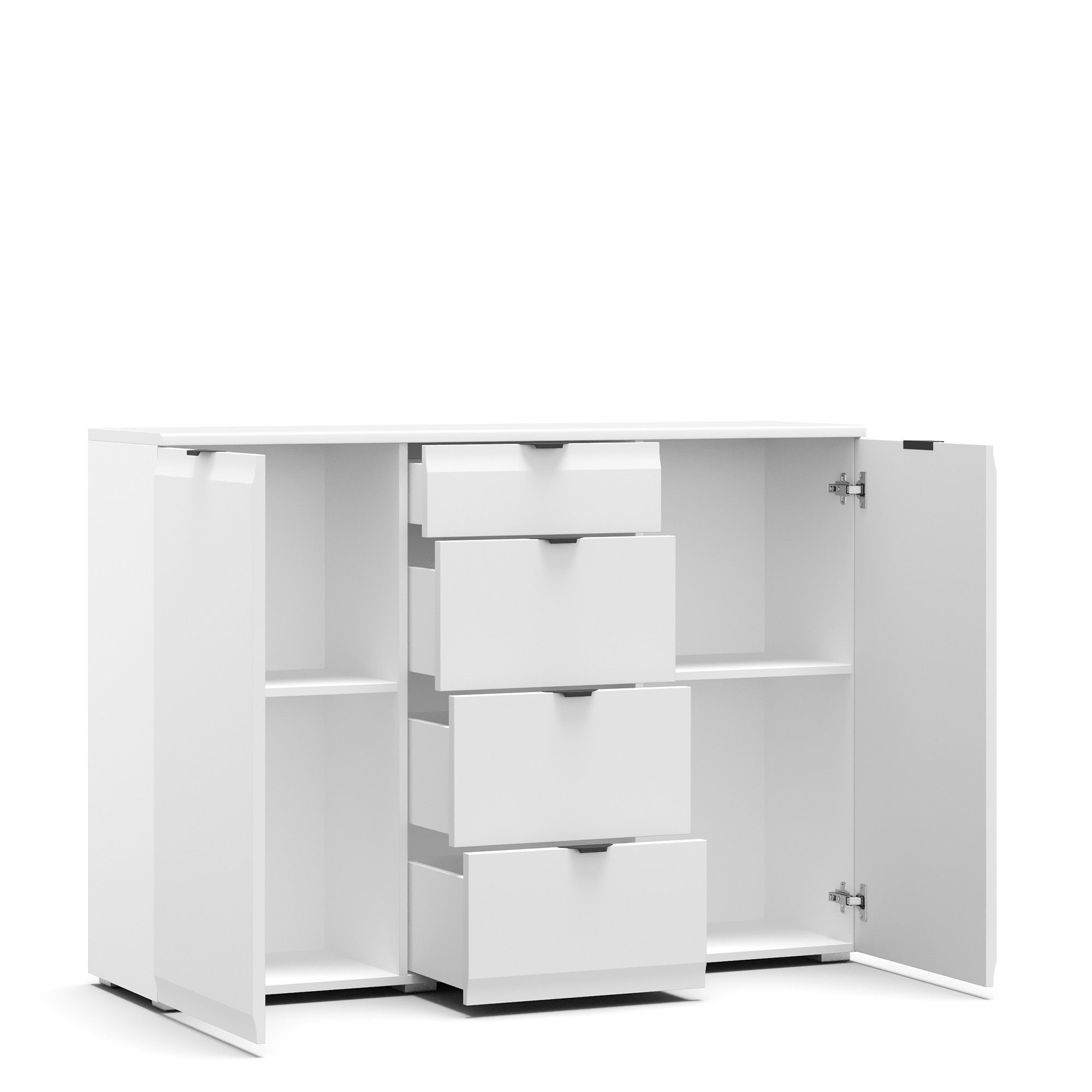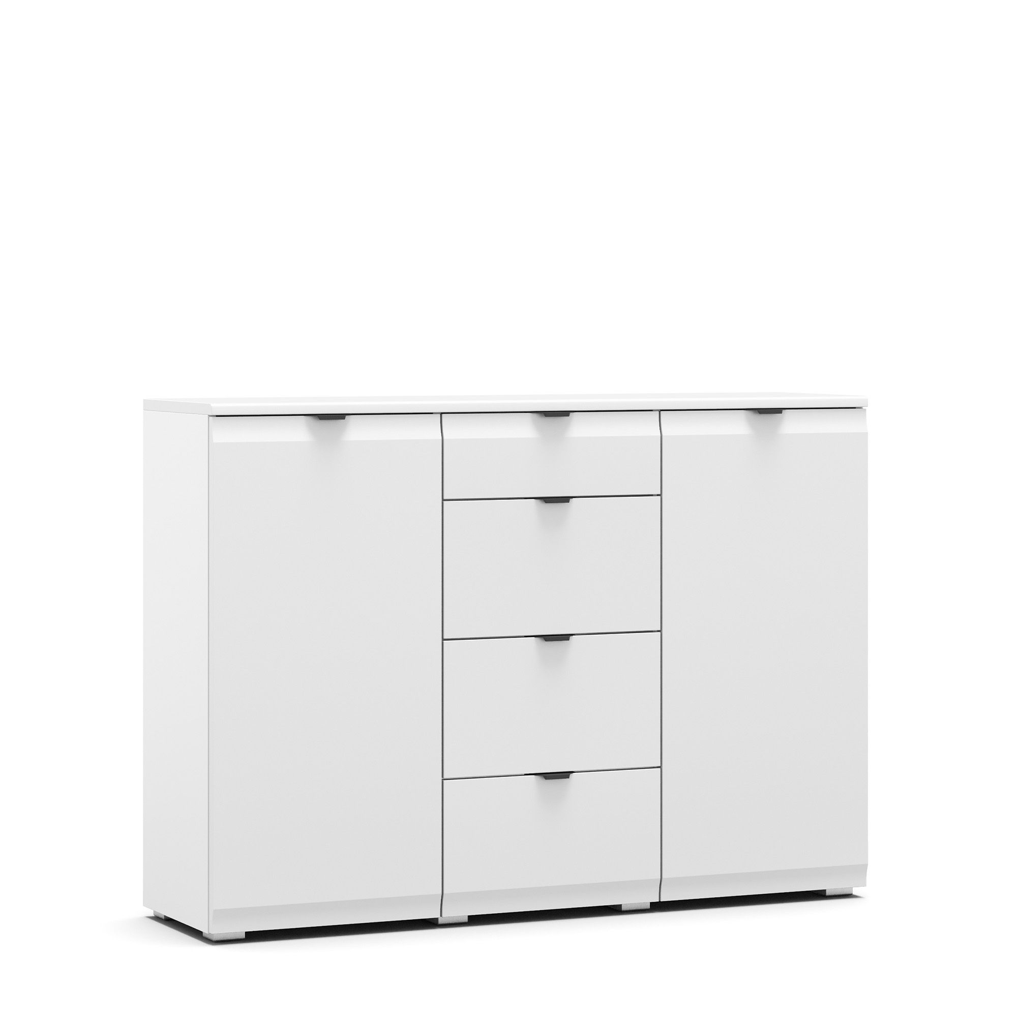 Вместительный комод Turin с четырьмя ящиками и двумя распашными фасадами может использоваться как отдельно, так и в композиции со стеллажом, который может иметь как правое, так и левое исполнение. На выбор предлагается несколько вариантов ручек и опор, благодаря чему можно придать мебели индивидуальный стиль.