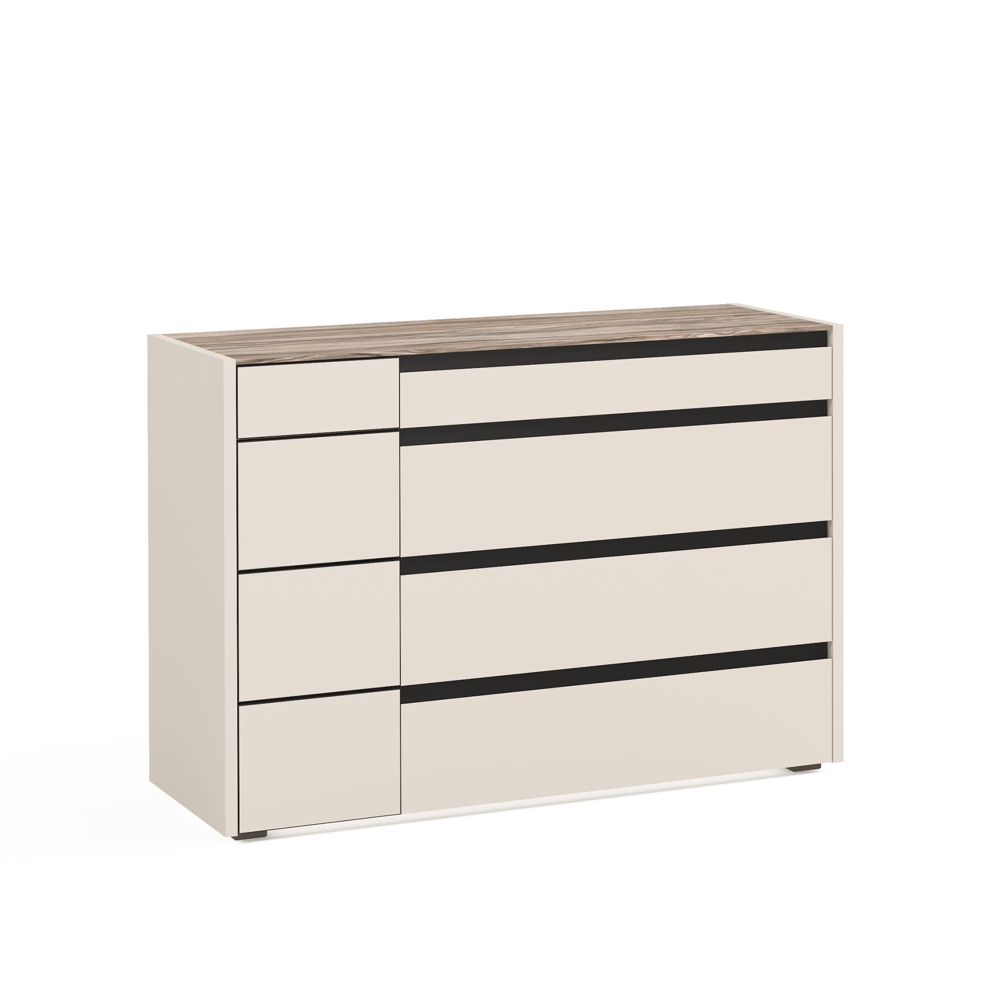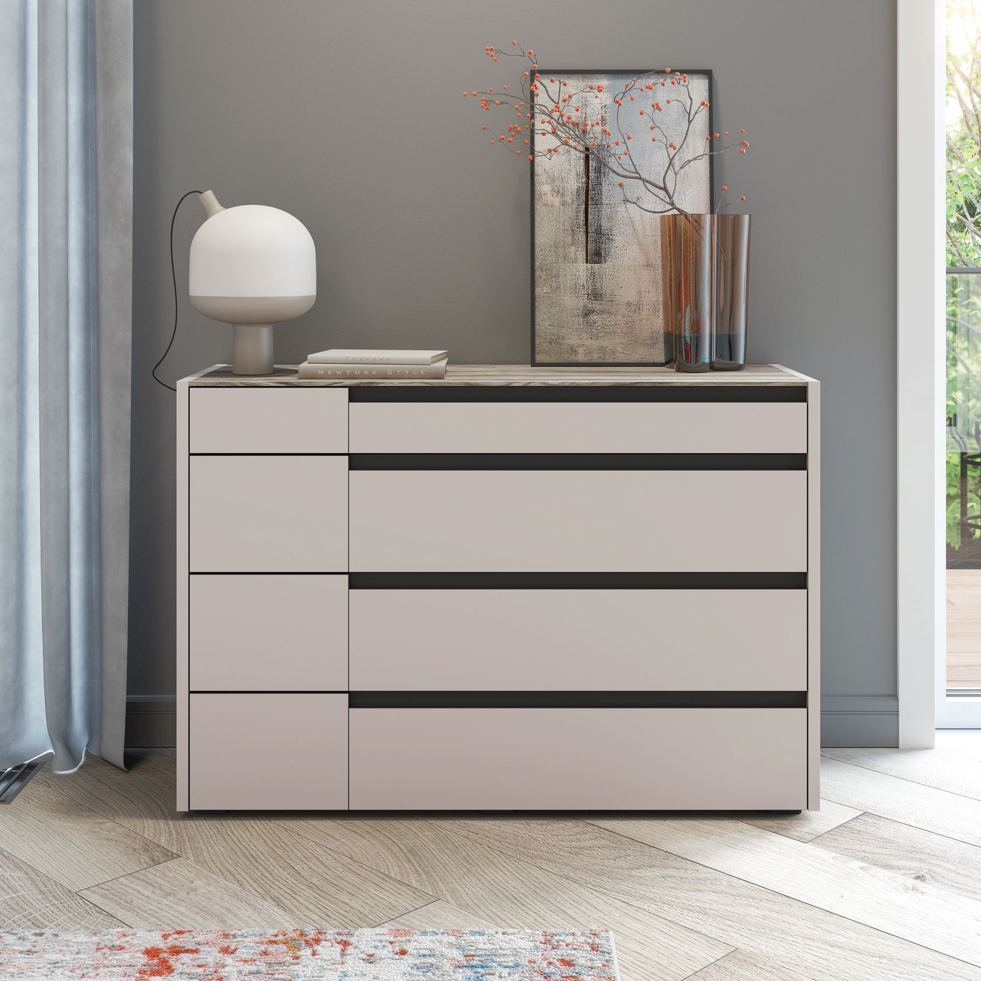 Вместительный комод ARTA оснащен четырьмя выдвижными ящиками с фасадами в отделке Cachmere матовый. В качестве системы открывания применяется интегрированная J-ручка серого цвета. Внутренняя поверхность выдвижных ящиков с изящной гранью боковины выполнена в отделке текстурой Шенилл, имитирующей натуральную ткань. Крышка комода декорирована текстурой Мрамор Medio.