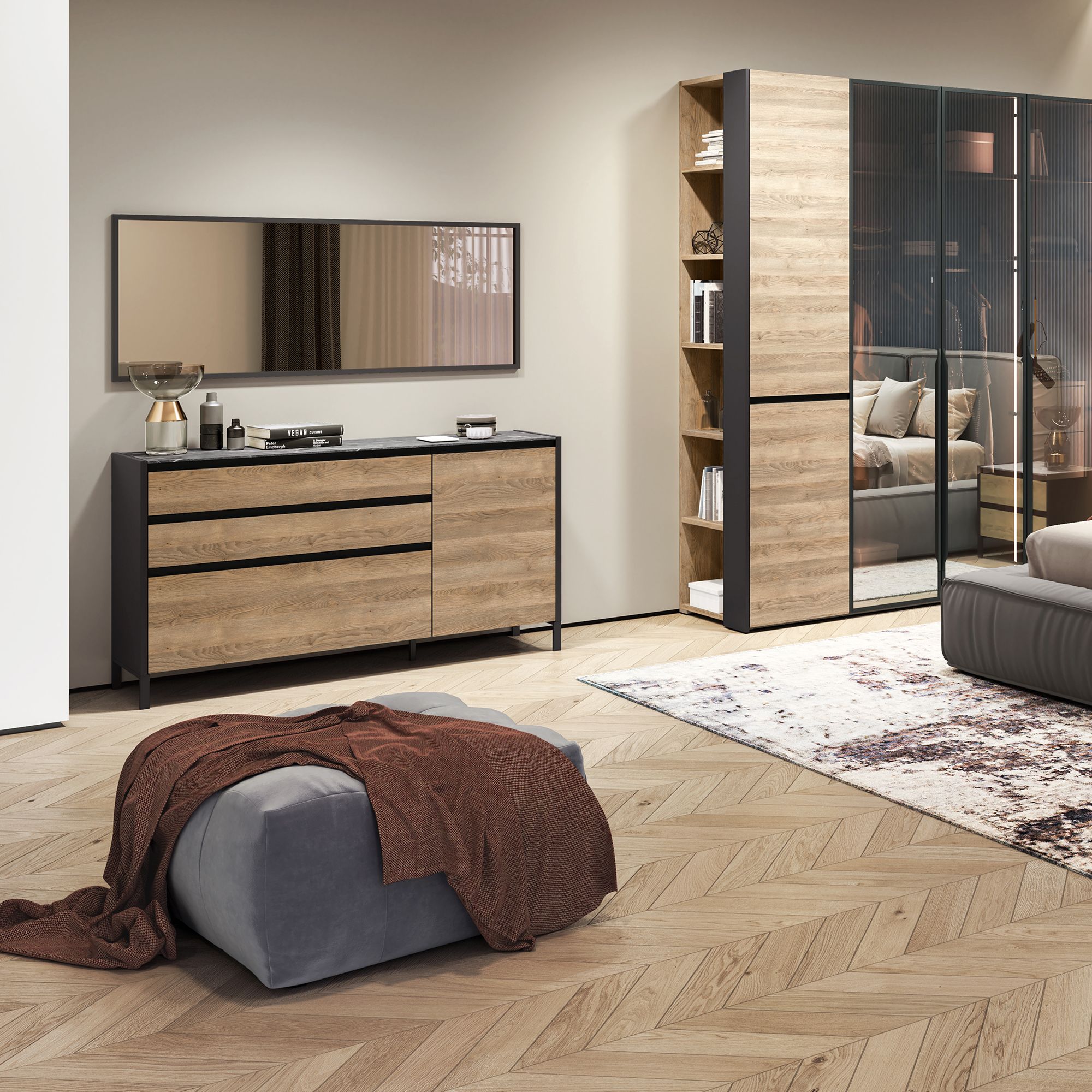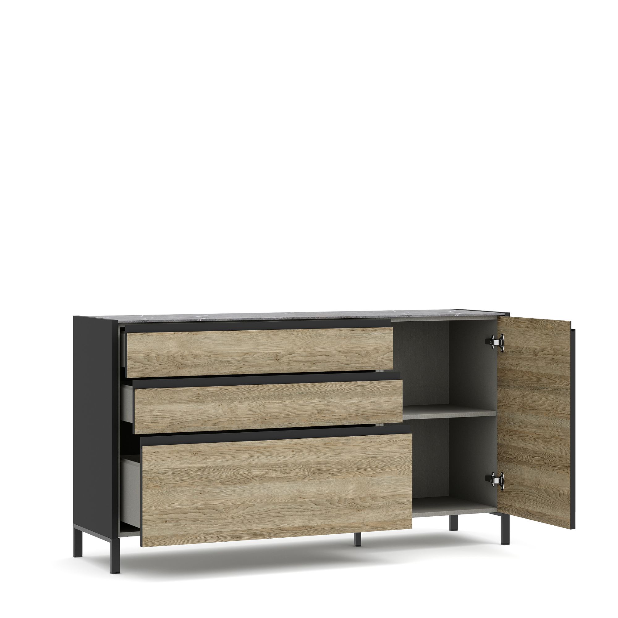 Комод BRUNO оснащен тремя выдвижными ящиками и распашным фасадом с эргономичными J-ручками. Внутренняя отделка в текстуре Шенилл создает ощущение, что ящики застелены натуральной тканью. Верхняя крышка комода выполнена в отделке Мрамор Patagonia. На выбор комод оснащается низкими регулируемыми опорами из пластика либо высокими опорами из металла в черной матовой отделке. При использовании высоких опор необходима также средняя невидимая опора.