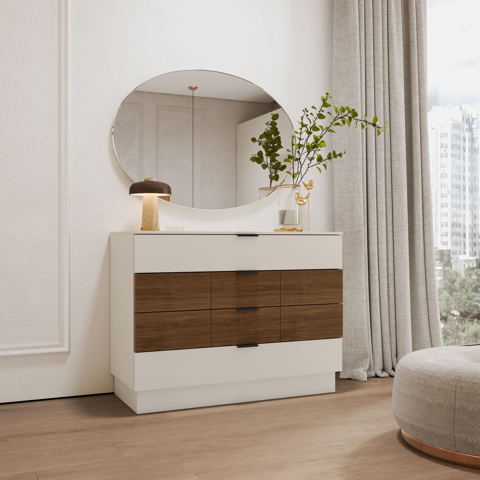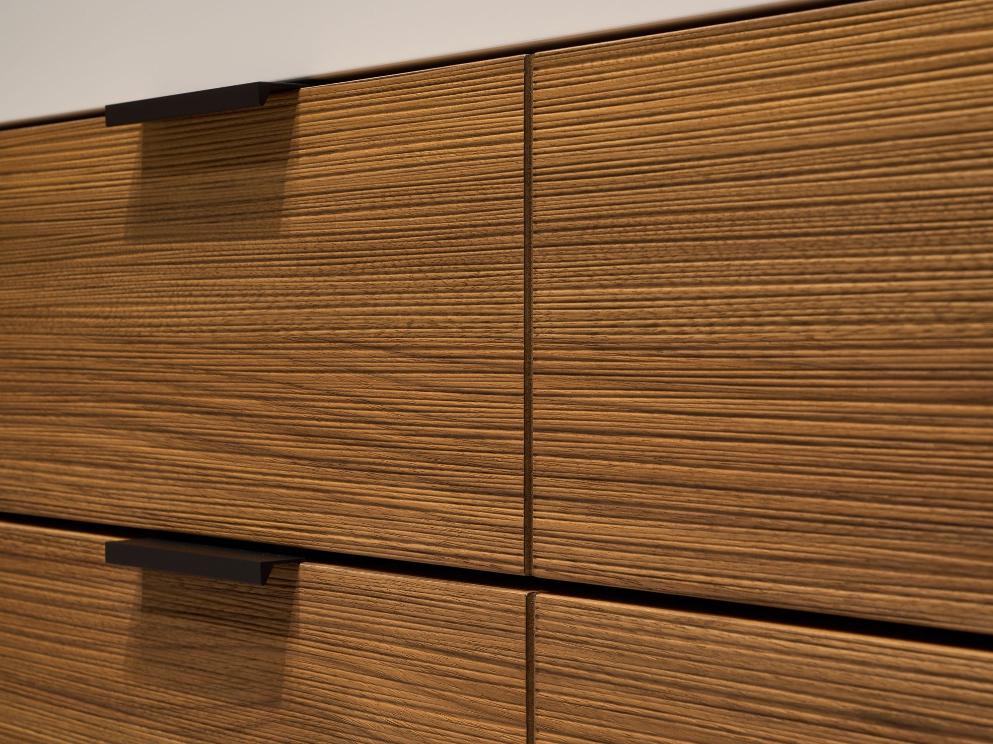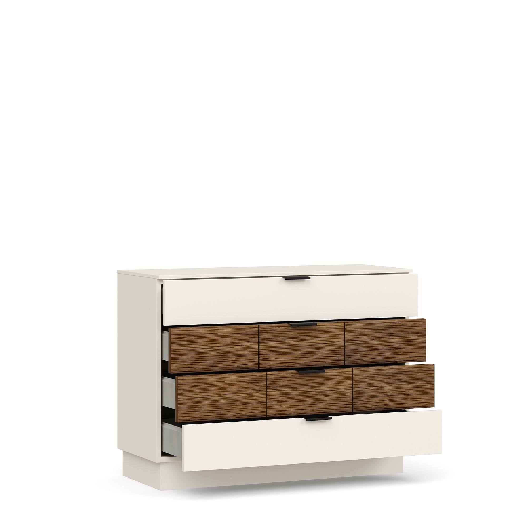 Комод MONAKO оснащен четырьмя выдвижными ящиками, выполненными в отделке натуральным шпоном и премиальной шелковой эмалью. Расположение ящиков можно менять.