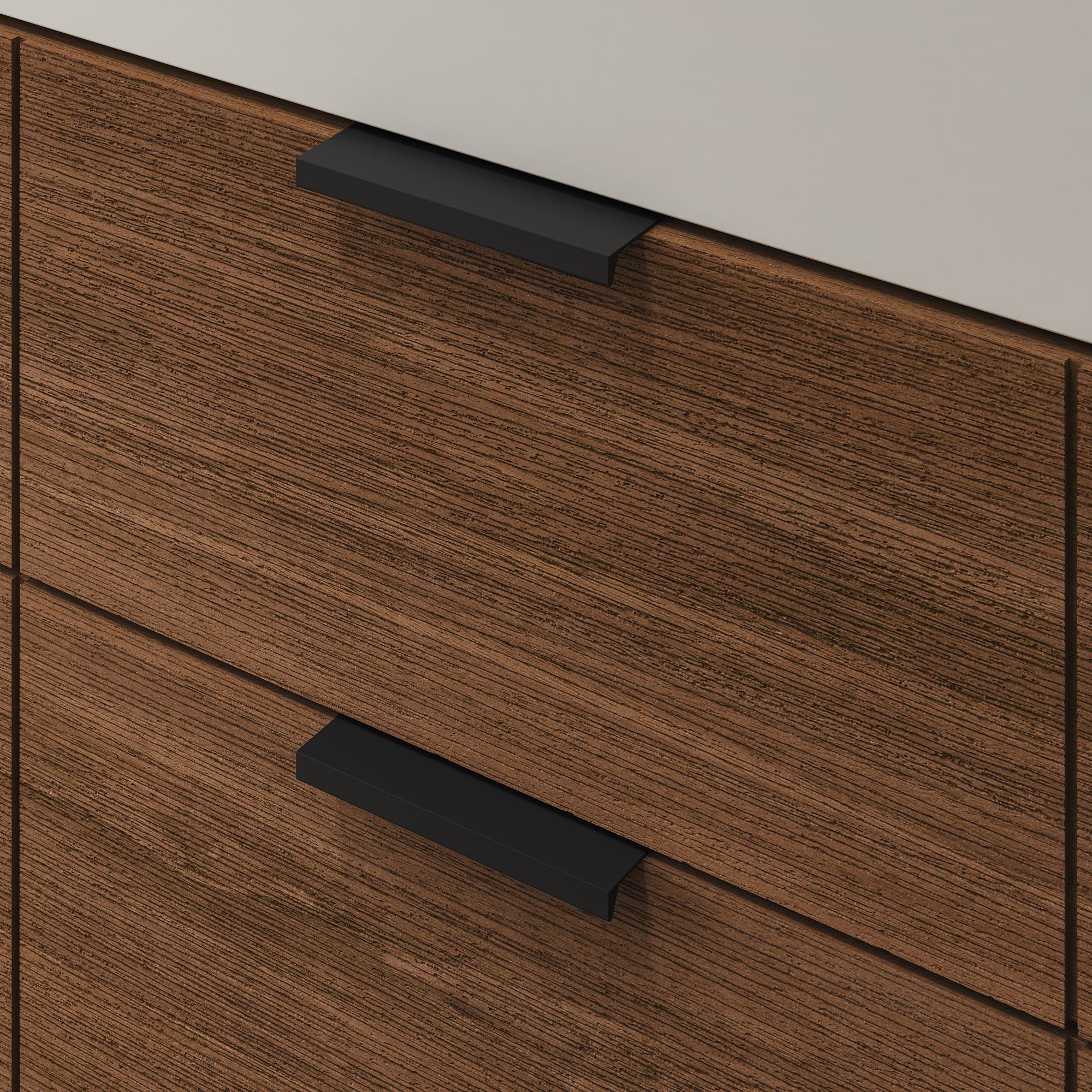В коллекции используются стильные накладные ручки европейского производства, изготовленные из металла с черным матовым покрытием. Фурнитура отличается высокой надежностью и сохраняет безупречный внешний вид на протяжении всего срока службы мебели.