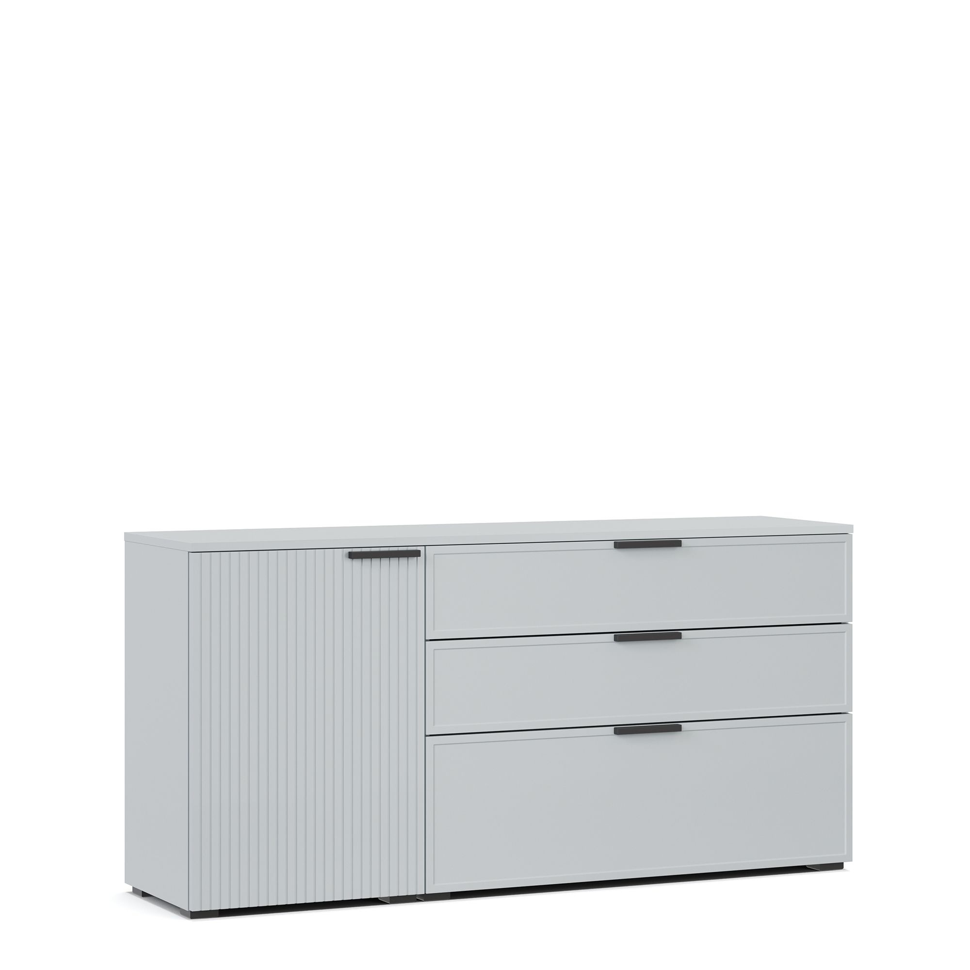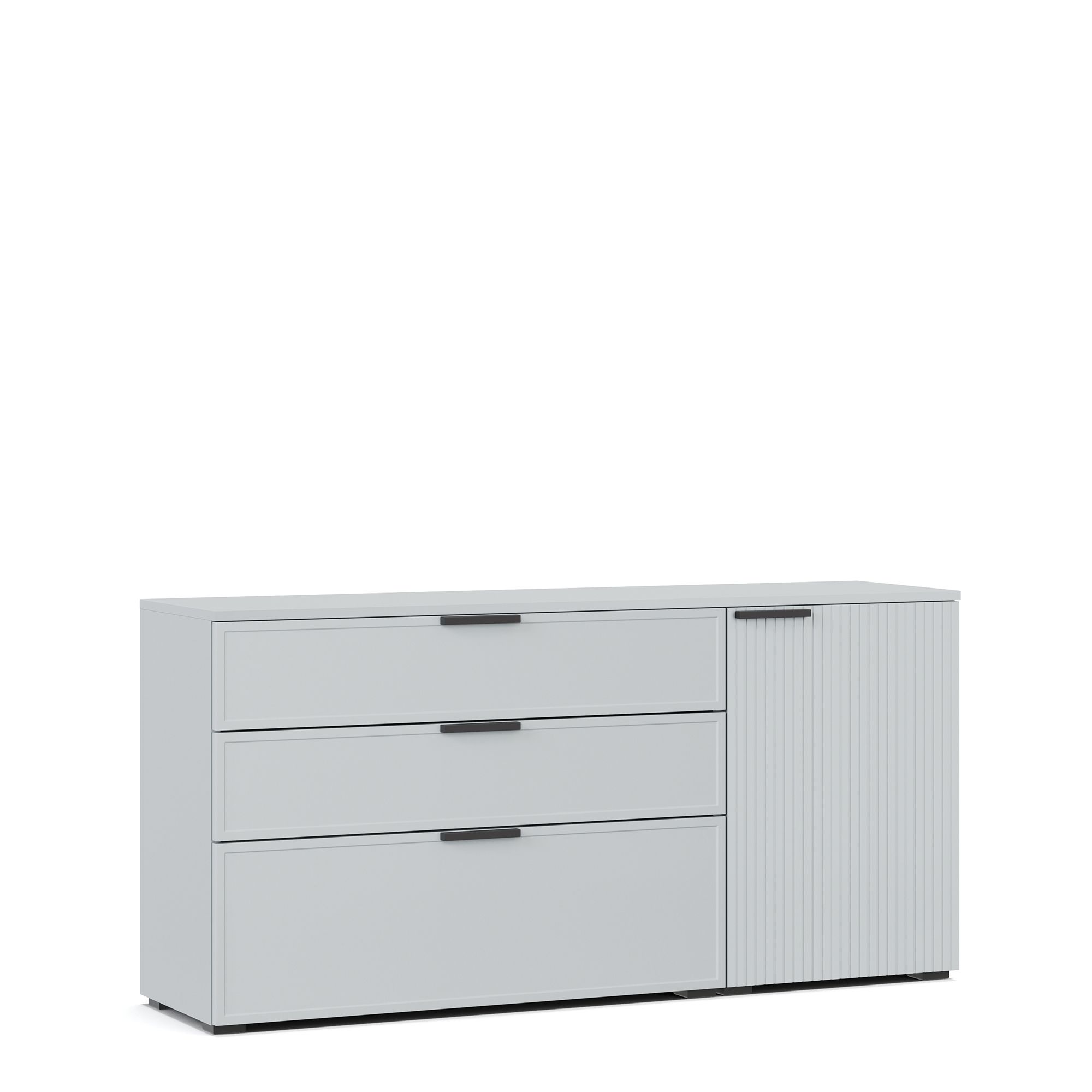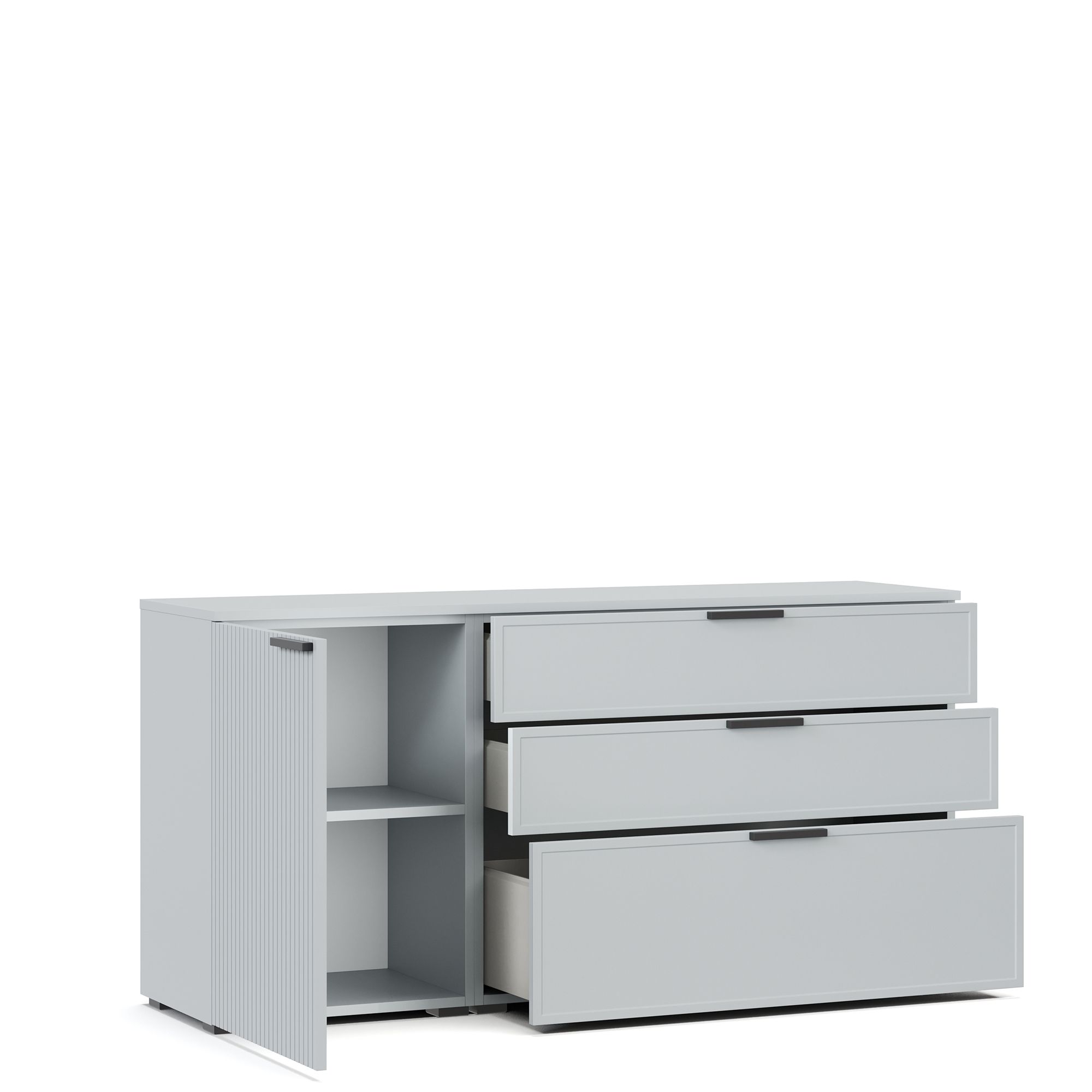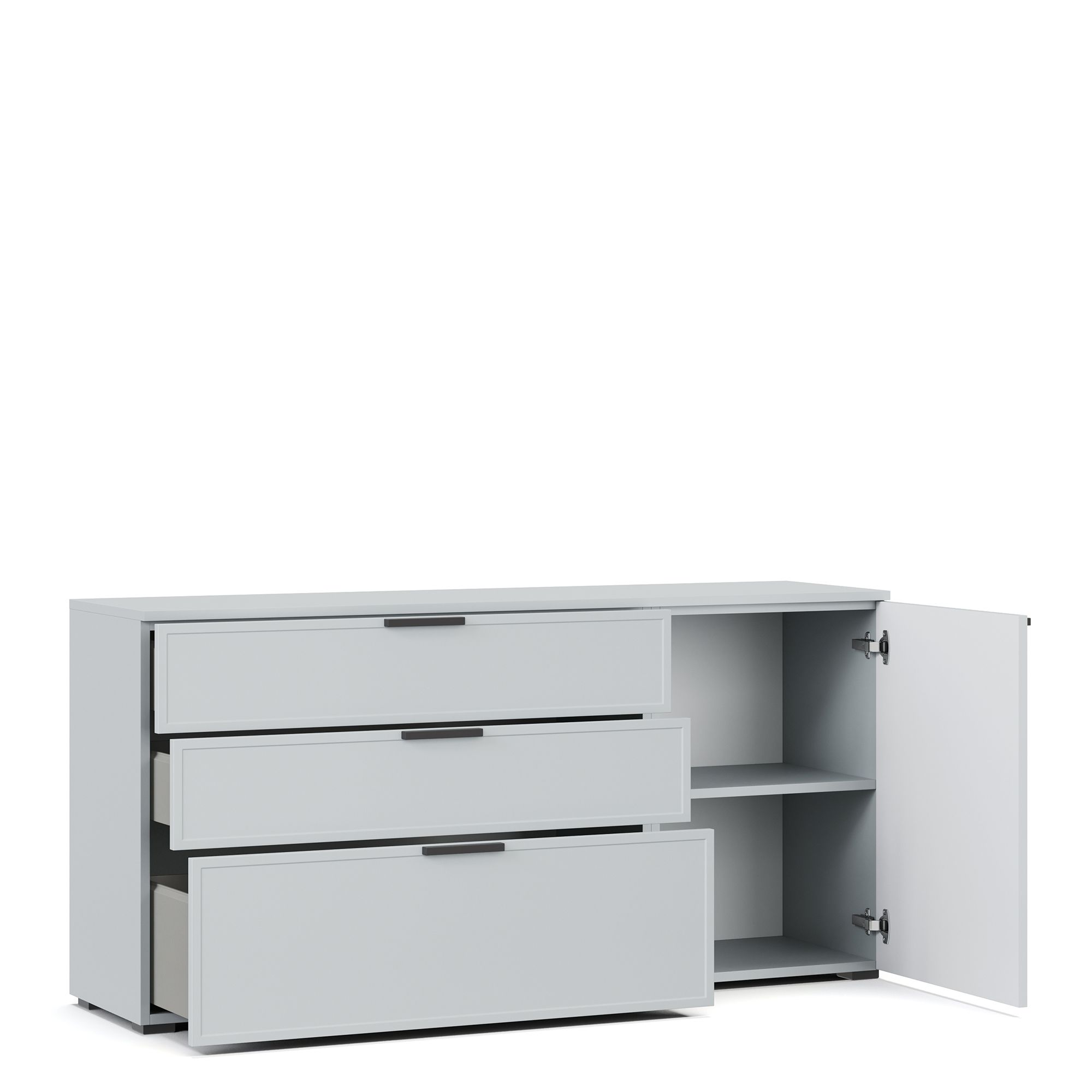 Комод NAPOLI оснащен тремя выдвижными ящиками, фасады которых декорированы тонкой рамкой, а также распашной дверью с вертикальной фрезеровкой. Внутренняя отделка ящиков выполнена в текстуре Шенилл. За глухим распашным фасадом располагается полка из ЛДСП. В качестве опции предлагается установка комода на опоры высотой 12 см (заказываются отдельно). Возможно исполнение комода в зеркальном отображении.