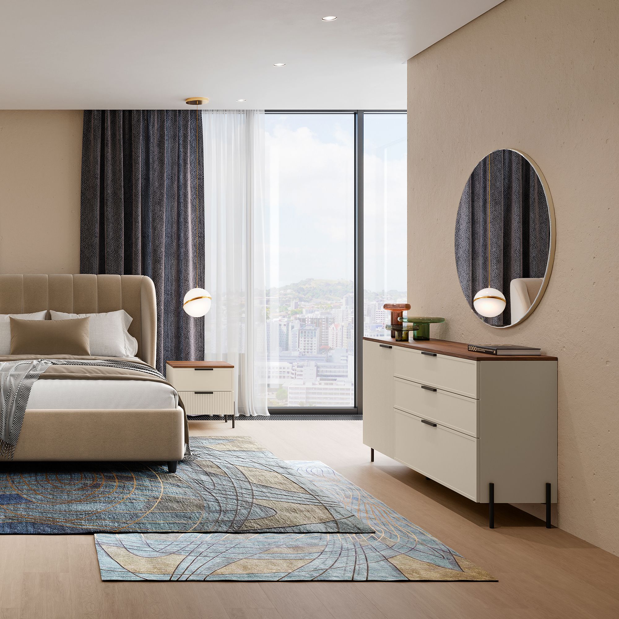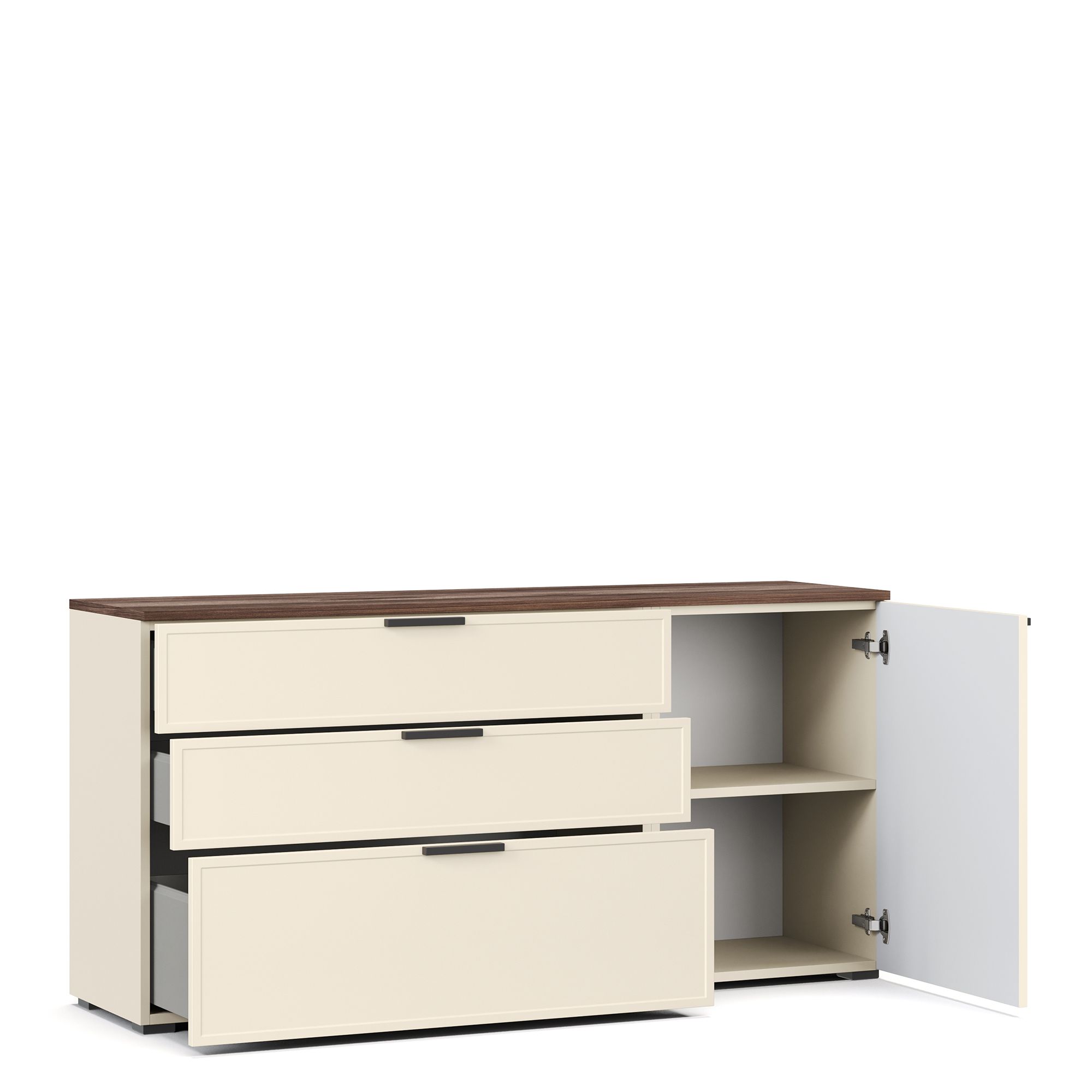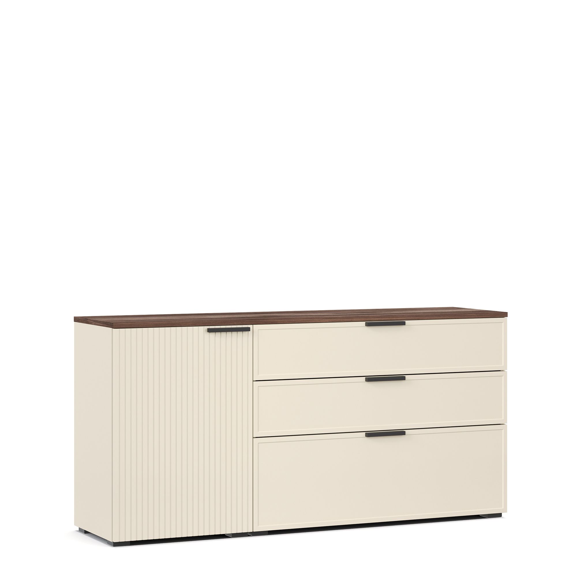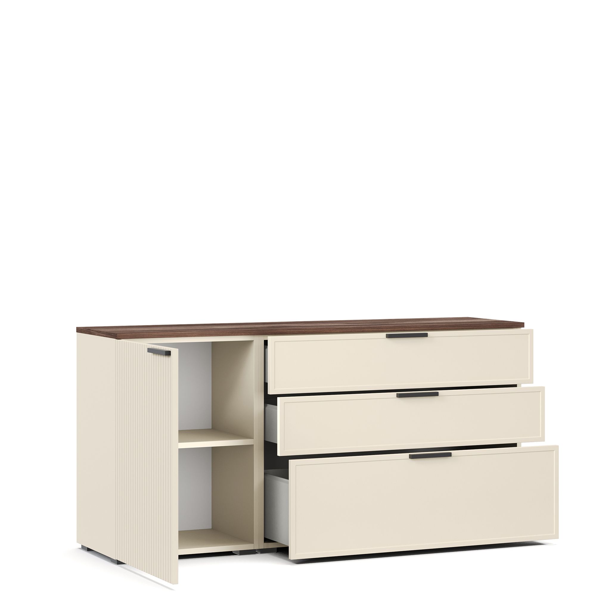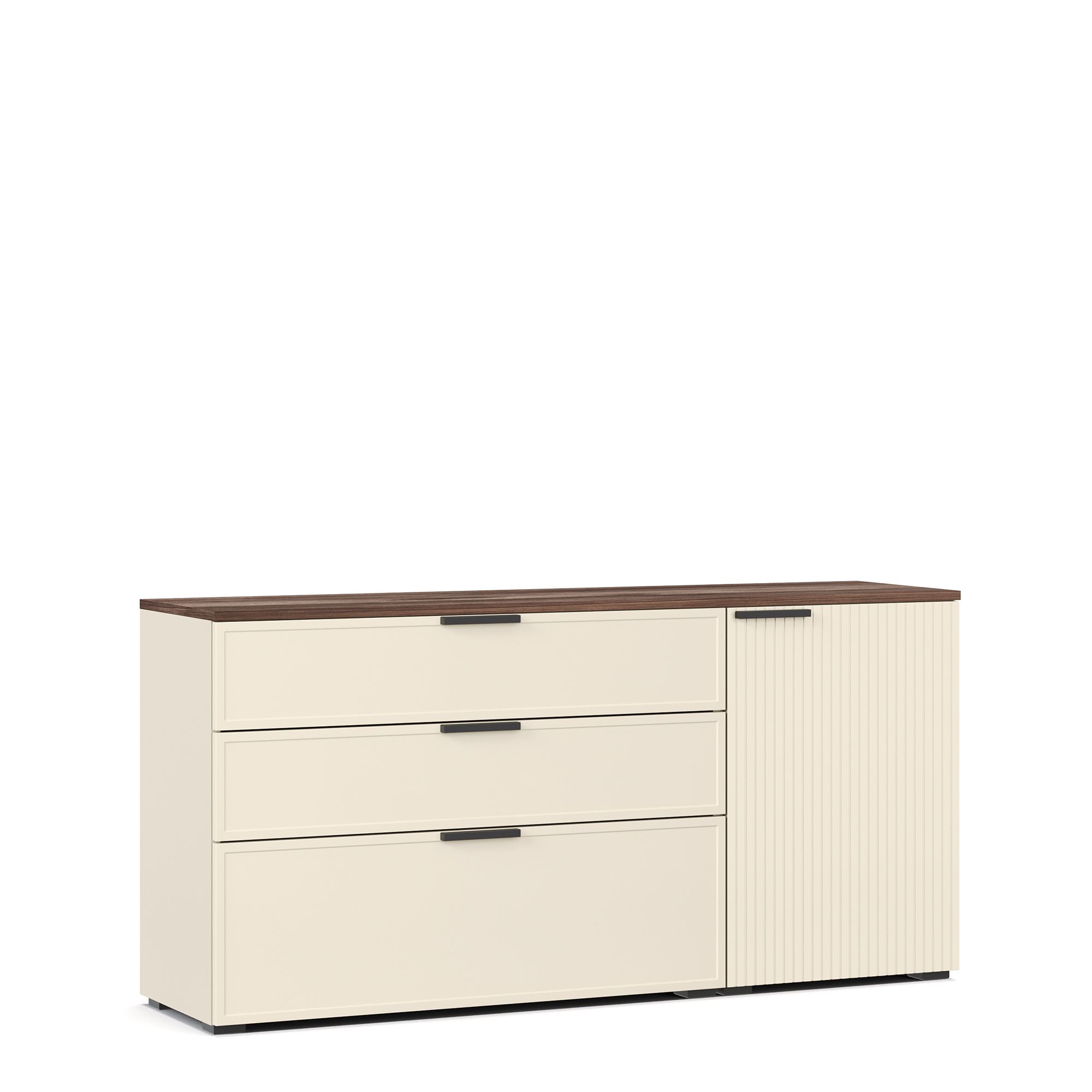 В коллекции используются стильные накладные ручки европейского производства, изготовленные из металла с черным матовым покрытием. Фурнитура отличается высокой надежностью и сохраняет безупречный внешний вид на протяжении всего срока службы мебели.