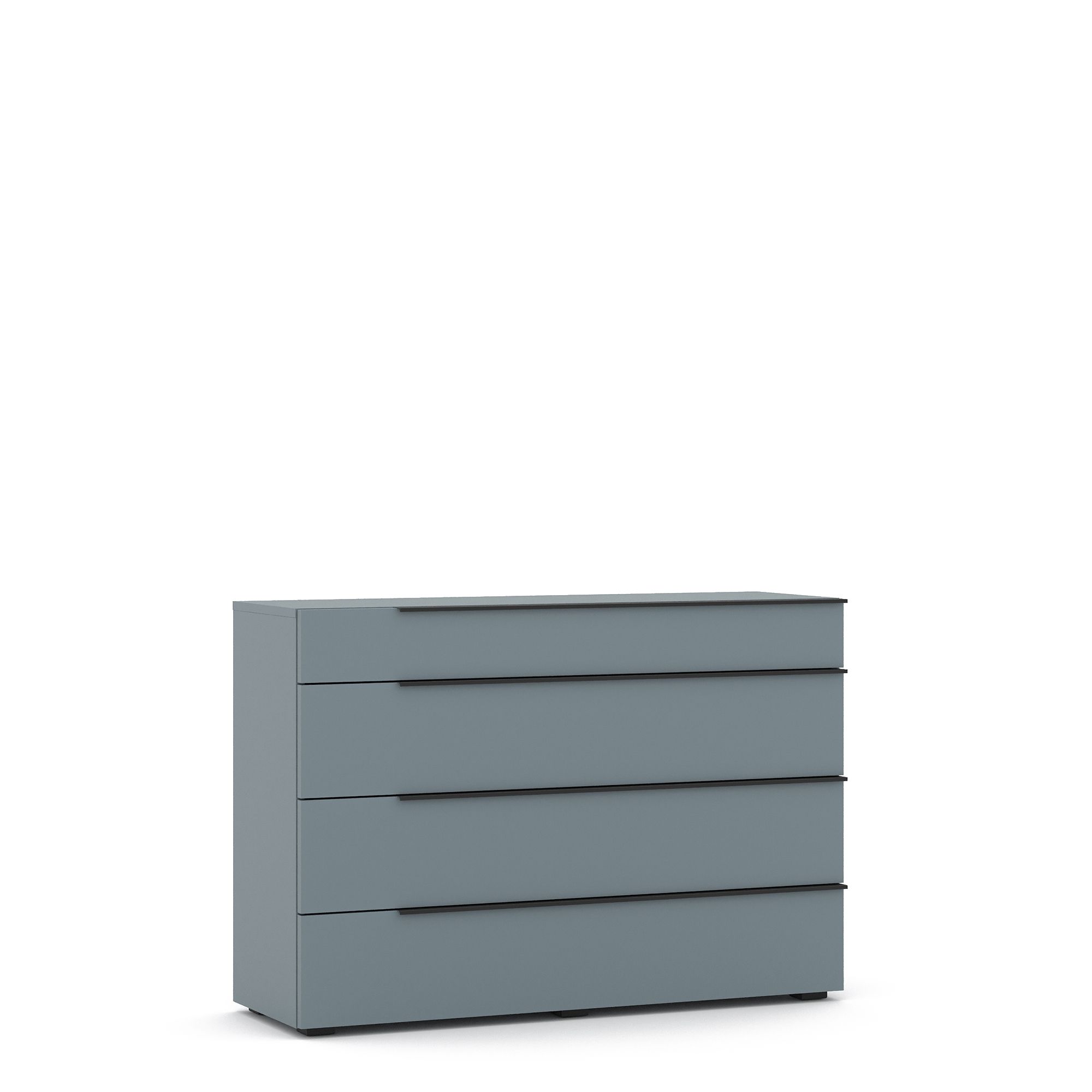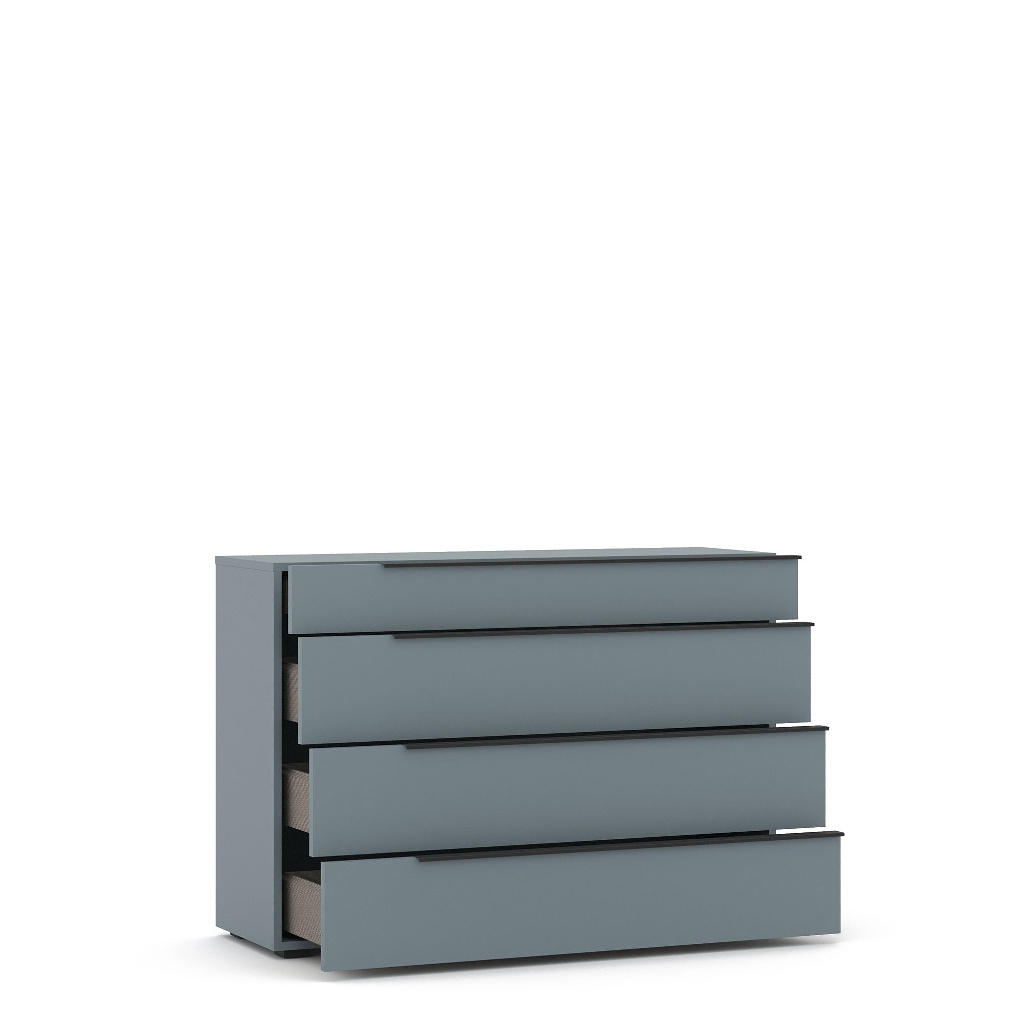 Комод TERAMO оснащен выдвижными ящиками, выполненными в монохромной отделке. Торцевые ручки из алюминия с черным матовым покрытием входят в комплектацию модели. Схема сборки предусматривает расположение ручек со смещением к правому краю фасада.