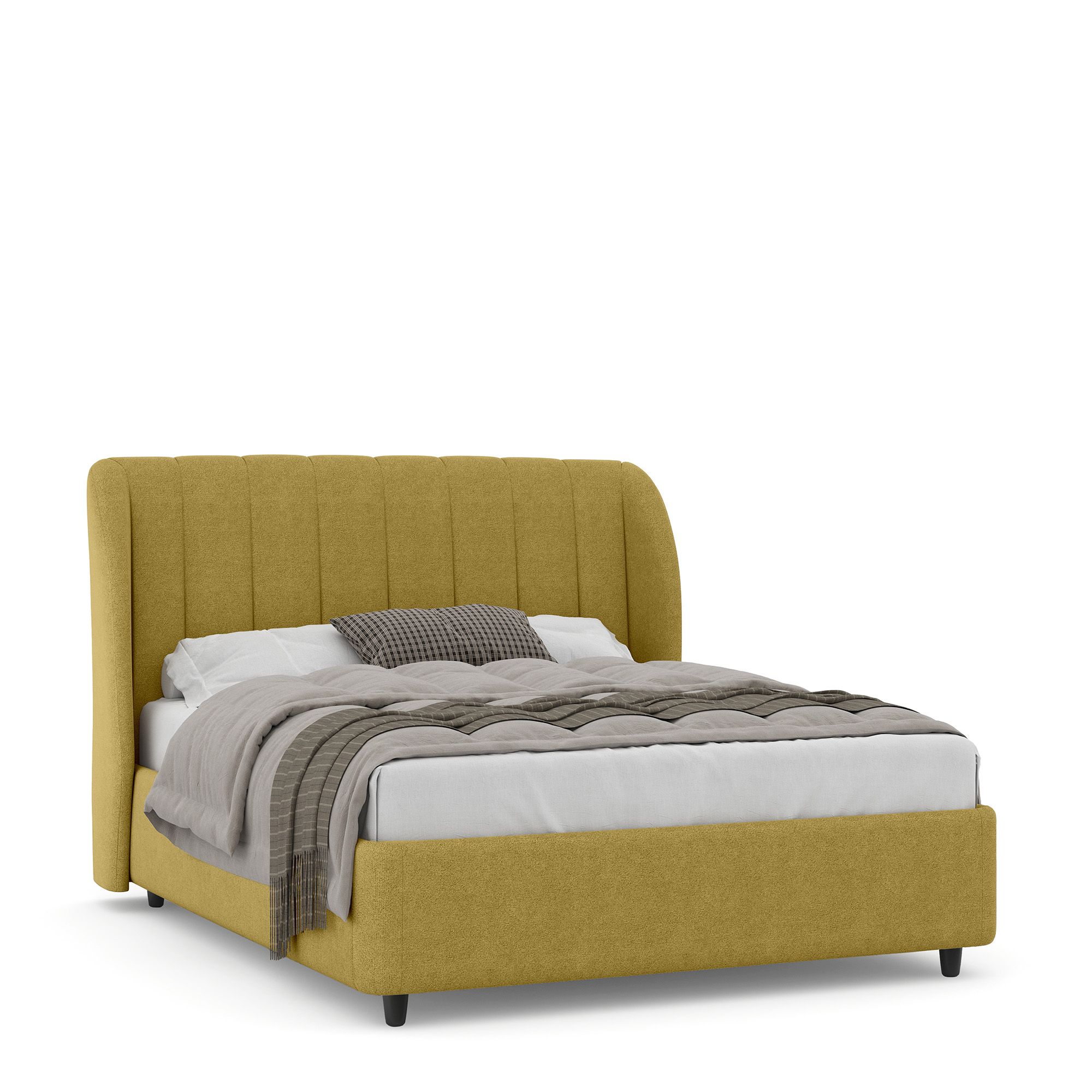 Полутораспальная кровать NAPOLI в полностью мягком текстильном корпусе оснащена высоким изголовьем с «ушками», декорированным вертикальной прострочкой. Модель с надежным подъемным механизмом и вместительным ящиком для белья. Металлическое основание и ортопедическая решетка (каркас – металл) входят в комплектацию модели. Максимальная высота матраса – до 50 см. Высота ножек кровати – 10 см.
