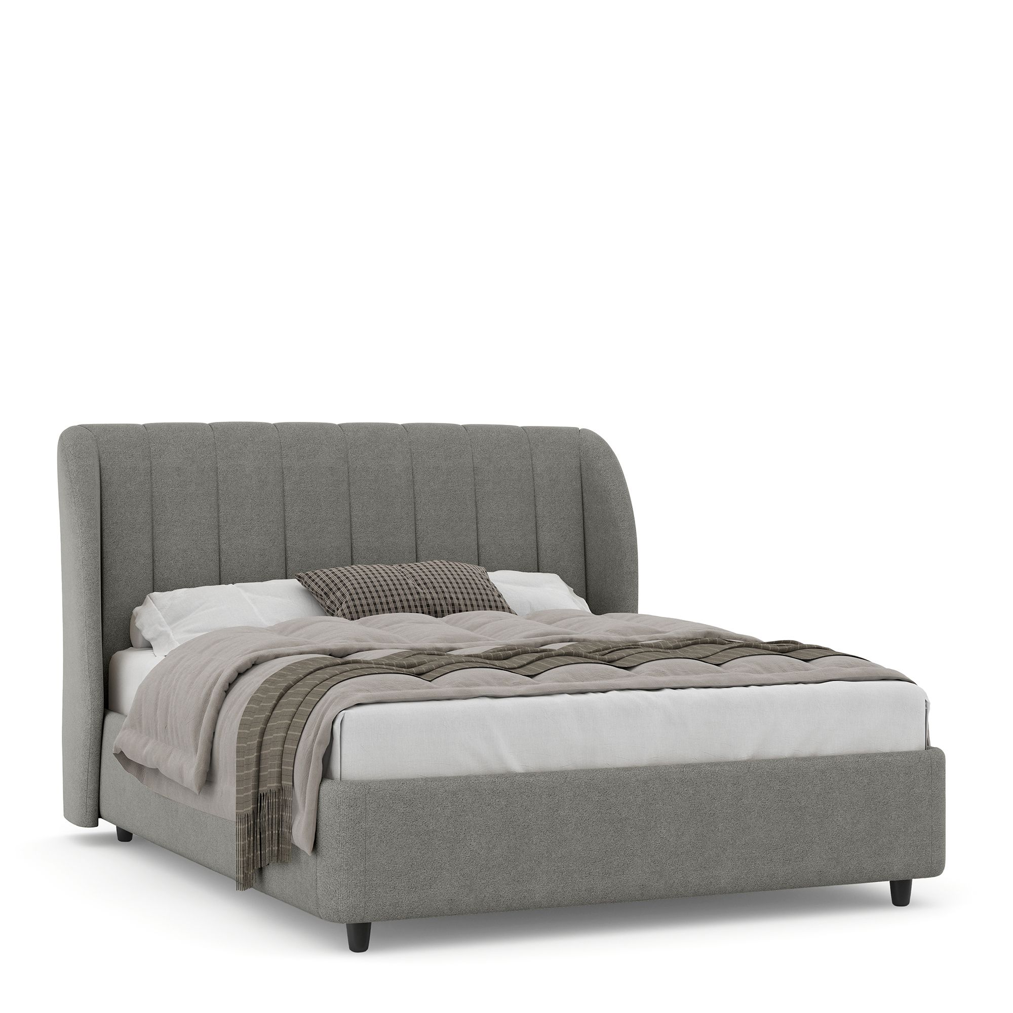 Двуспальная кровать NAPOLI в полностью мягком текстильном корпусе оснащена высоким изголовьем с «ушками», декорированным вертикальной прострочкой. Модель с надежным подъемным механизмом и вместительным ящиком для белья. Металлическое основание и ортопедическая решетка (каркас – металл) входят в комплектацию модели. Максимальная высота матраса – до 50 см. Высота ножек кровати – 10 см.