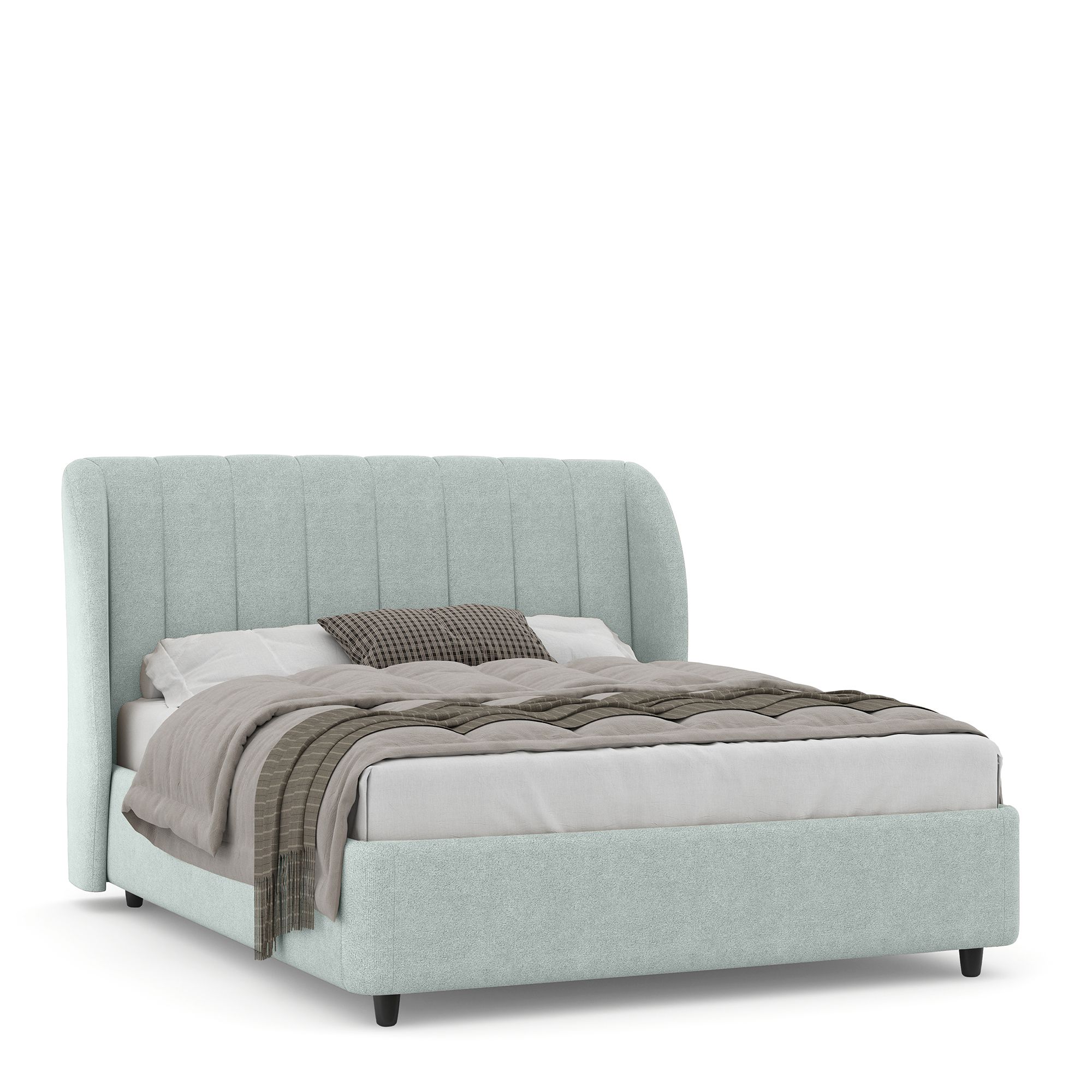 Двуспальная кровать NAPOLI в полностью мягком текстильном корпусе оснащена высоким изголовьем с «ушками», декорированным вертикальной прострочкой. Модель с надежным подъемным механизмом и вместительным ящиком для белья. Металлическое основание и ортопедическая решетка (каркас – металл) входят в комплектацию модели. Максимальная высота матраса – до 50 см. Высота ножек кровати – 10 см.