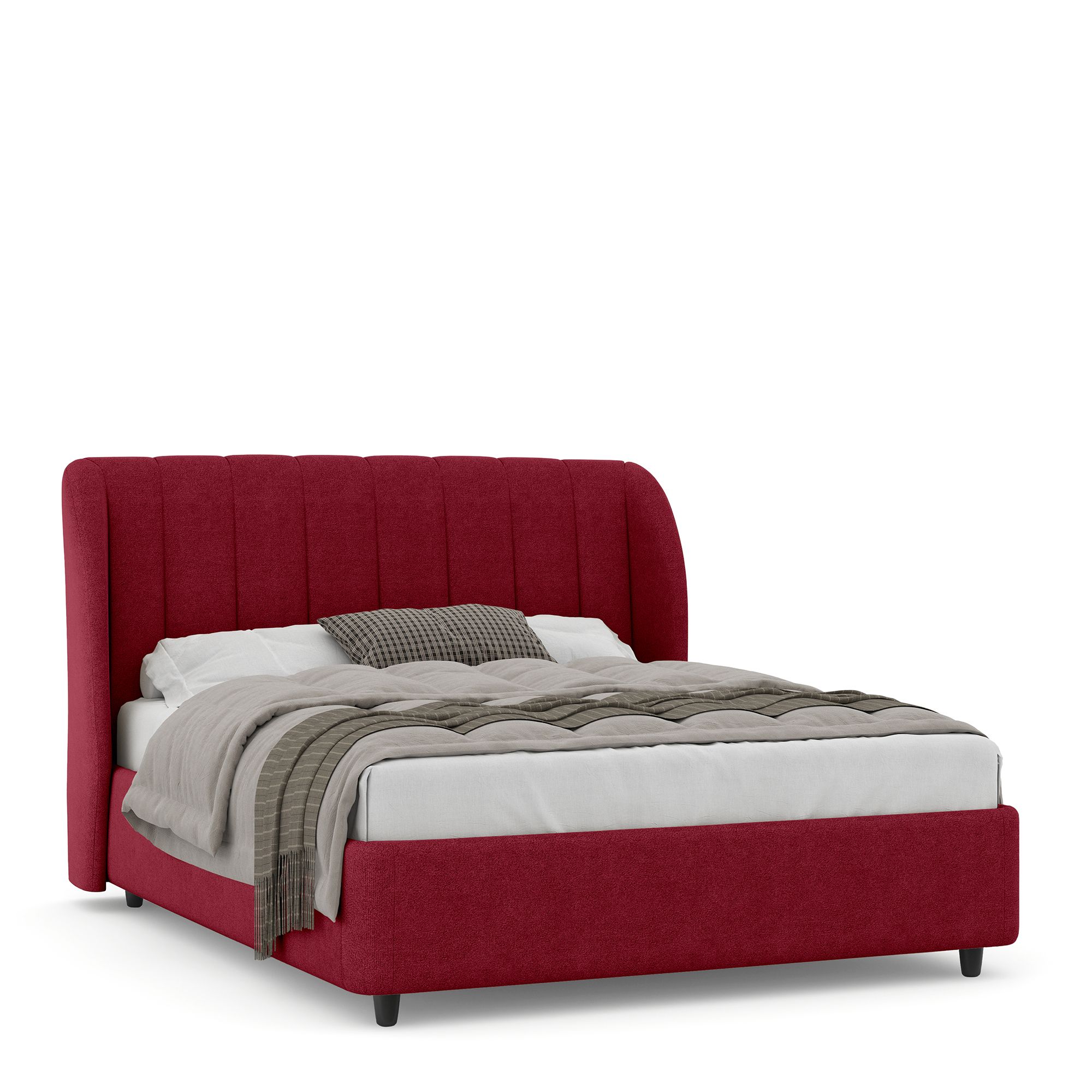 Двуспальная кровать NAPOLI в полностью мягком текстильном корпусе оснащена высоким изголовьем с «ушками», декорированным вертикальной прострочкой. Модель с надежным подъемным механизмом и вместительным ящиком для белья. Металлическое основание и ортопедическая решетка (каркас – металл) входят в комплектацию модели. Максимальная высота матраса – до 50 см. Высота ножек кровати – 10 см.
