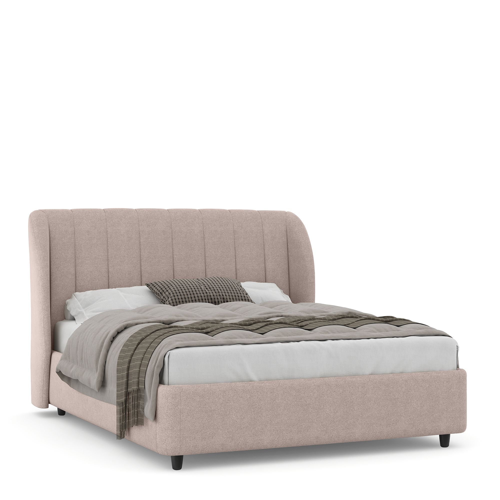 Двуспальная кровать NAPOLI в полностью мягком текстильном корпусе оснащена высоким изголовьем с «ушками», декорированным вертикальной прострочкой. Модель с надежным подъемным механизмом и вместительным ящиком для белья. Металлическое основание и ортопедическая решетка (каркас – металл) входят в комплектацию модели. Максимальная высота матраса – до 50 см. Высота ножек кровати – 10 см.