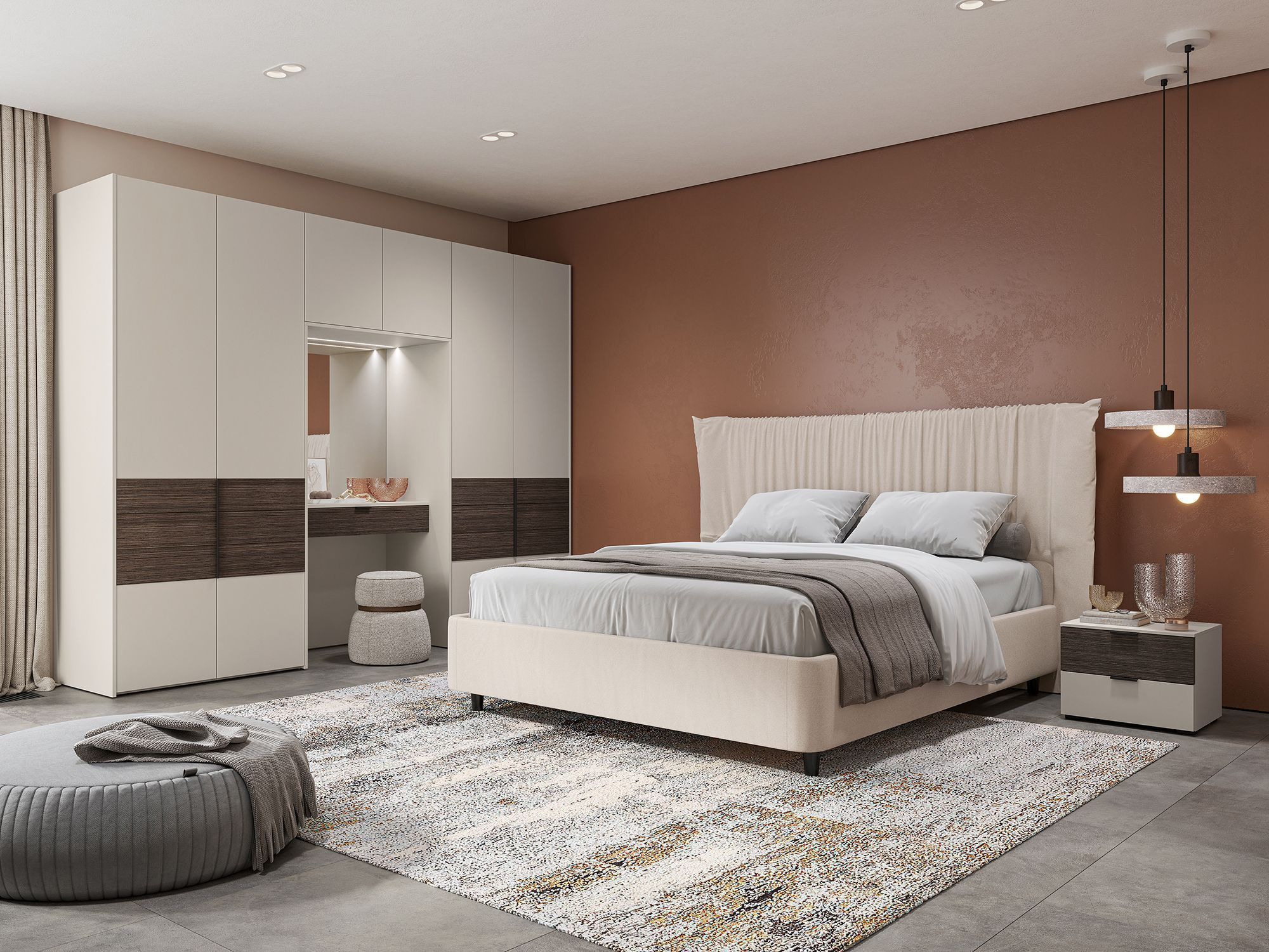 Благодаря мягкому наполнителю изголовья любители сериалов и чтения перед сном могут расположиться с комфортом. Строгая и лаконичная отделка в виде вертикальных утяжек визуально облегчает изголовье и делает его выше. Обивка кровати специально разработана по заказу бренда «Дятьково Design».