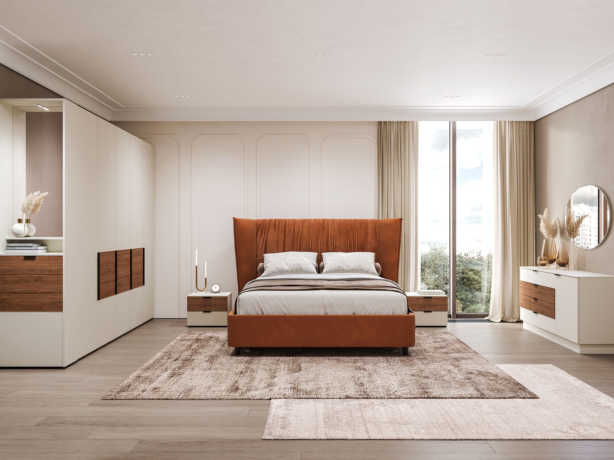 Благодаря мягкому наполнителю изголовья любители сериалов и чтения перед сном могут расположиться с комфортом. Строгая и лаконичная отделка в виде вертикальных утяжек визуально облегчает изголовье и делает его выше. Обивка кровати специально разработана по заказу бренда «Дятьково Design».