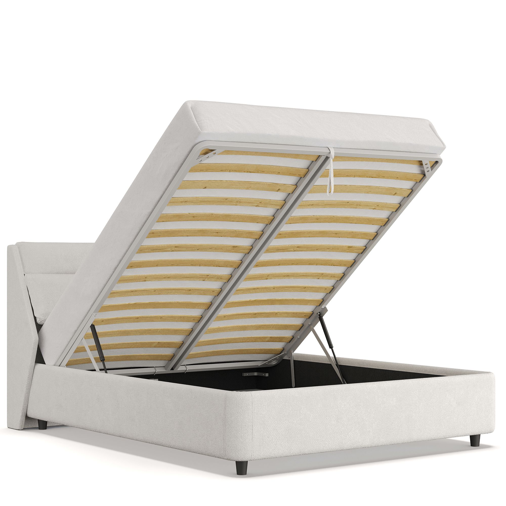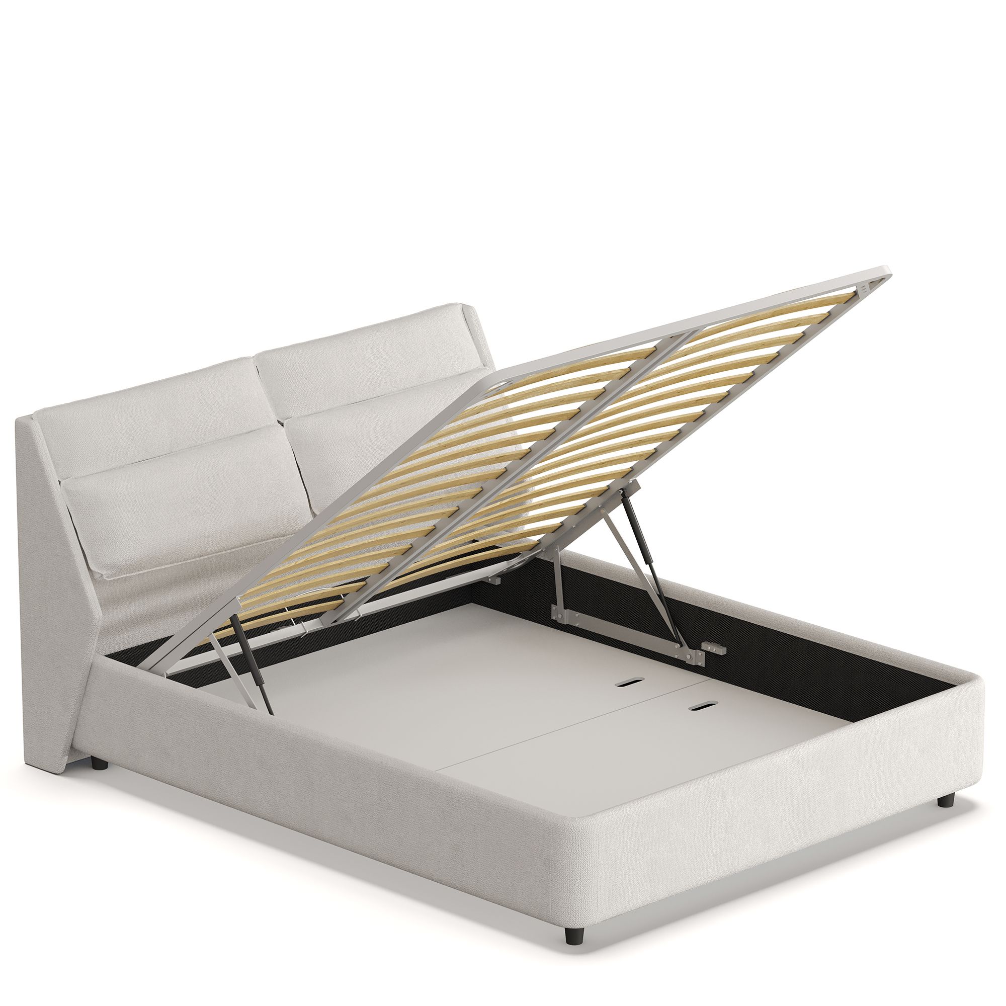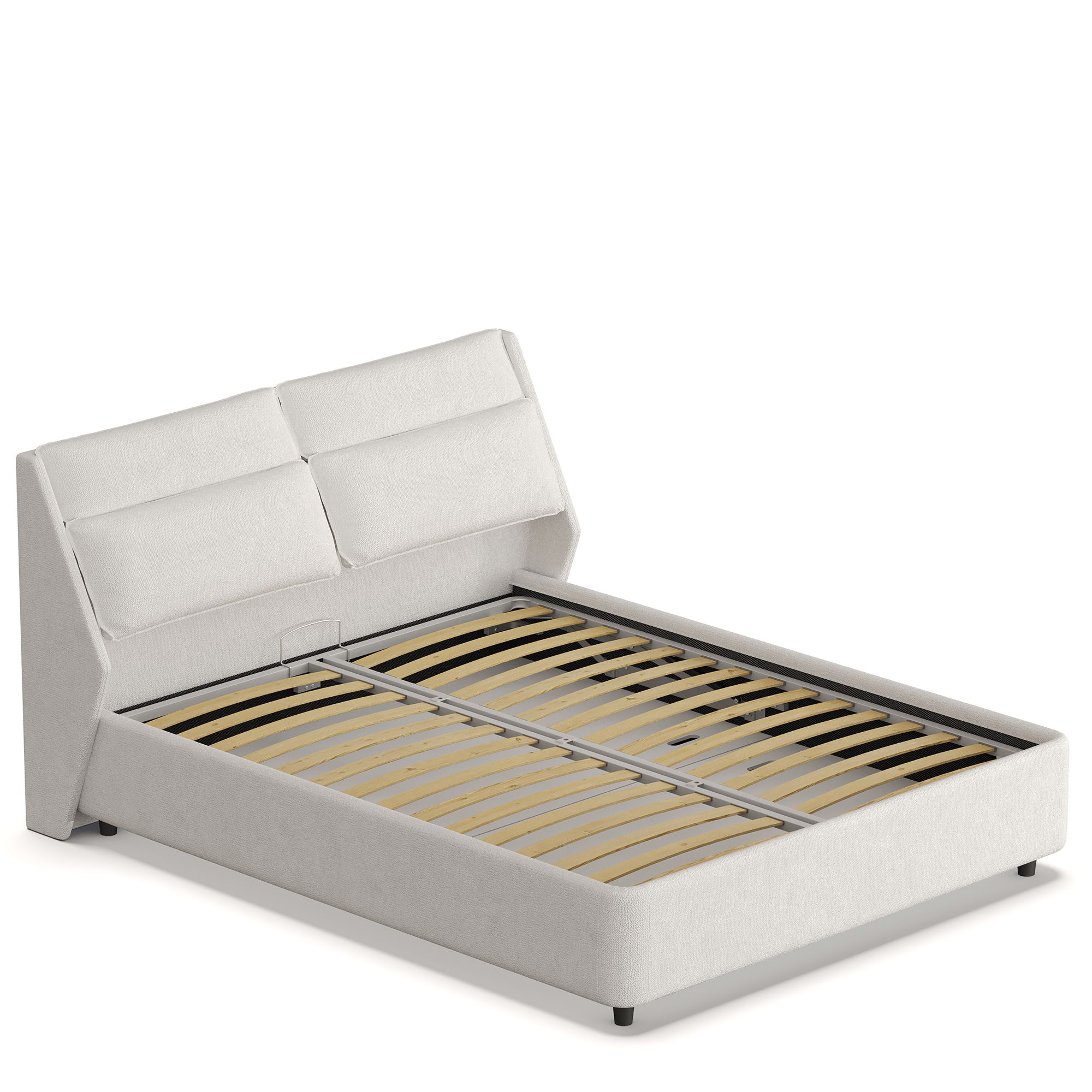 Кровать TEWIN выполнена в полностью мягком текстильном корпусе из рогожки, а ее изголовье оснащено необычными подушками, расположенными под углом, чтобы на них было удобно облокотиться, отдыхая за чтением или просмотром сериала. Скругленные углы основания обеспечивают безопасность использования, а дизайн с высокими ножными опорами не создает препятствий при уборке с помощью робота-пылесоса. Модель оснащена надежным подъемным механизмом и вместительным ящиком для белья. Металлическое основание и ортопедическая решетка (каркас – металл) входят в комплектацию.