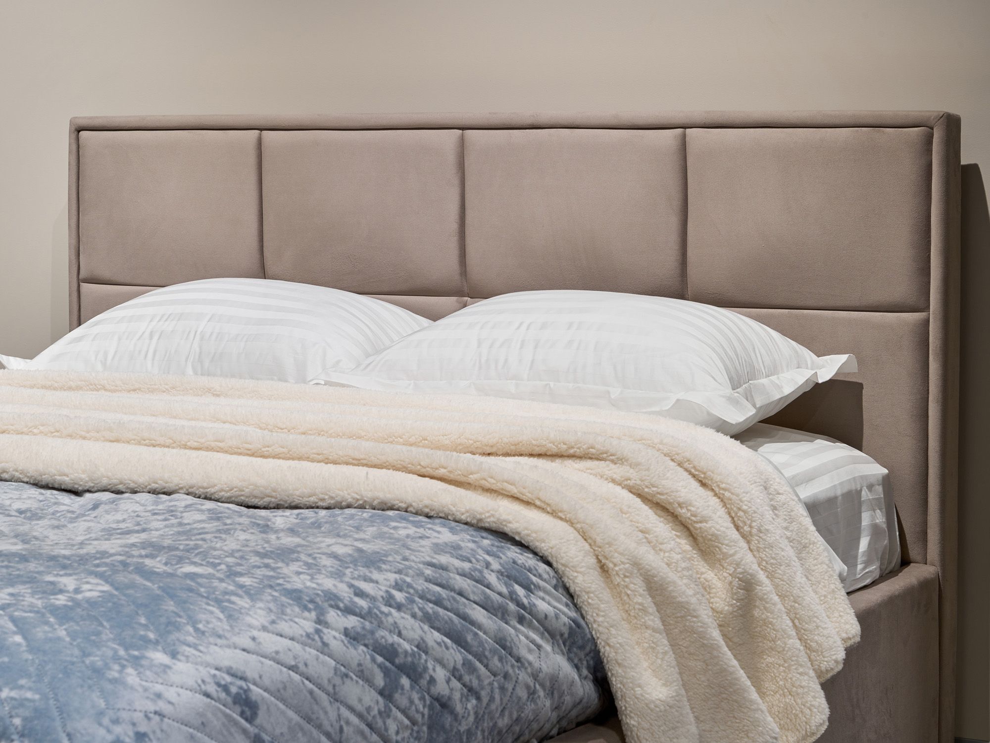 Кровать DUBLIN в мягком текстильном корпусе оснащена высоким изголовьем из нежнейшего велюра. Изголовье и изножье декорированы объемной утяжкой и рамкой, что придает кровати дополнительную изысканность. Вместительный бельевой ящик модели создает дополнительное пространство для хранения, а надежное металлическое основание устойчиво к нагрузкам и усиливает ортопедический эффект матраса.