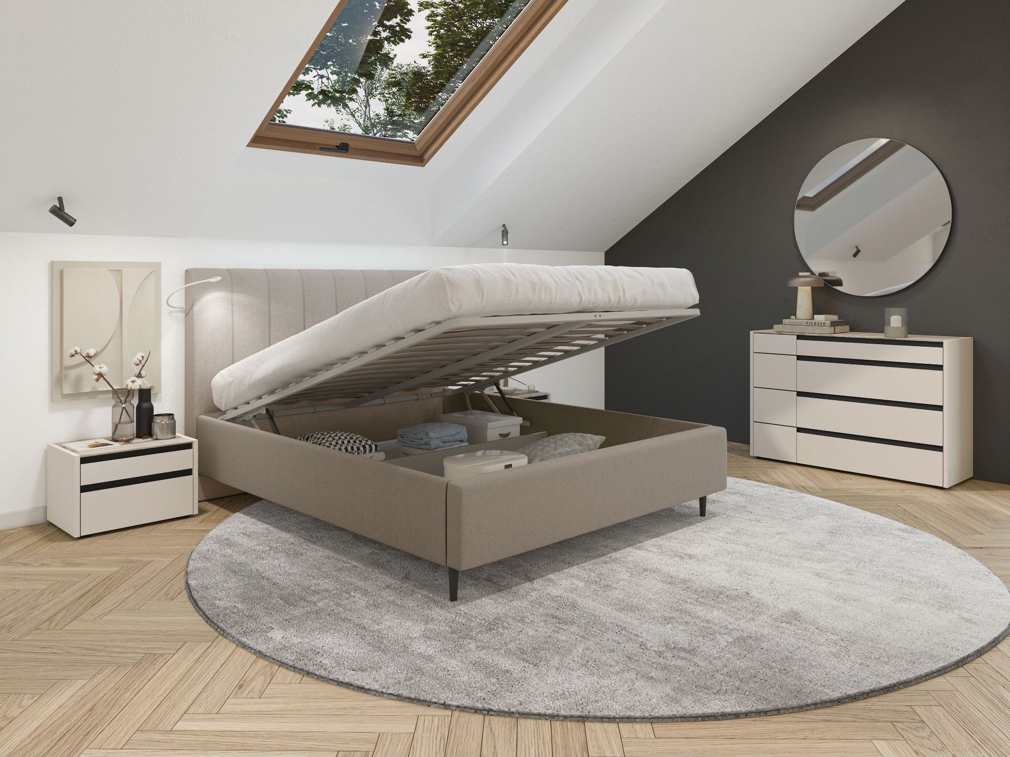 Под решеткой располагается большое (по всей площади кровати) отделение для хранения одеял, подушек, демисезонной одежды и других вещей. Ящик разделен на два отсека для сортировки вещей.