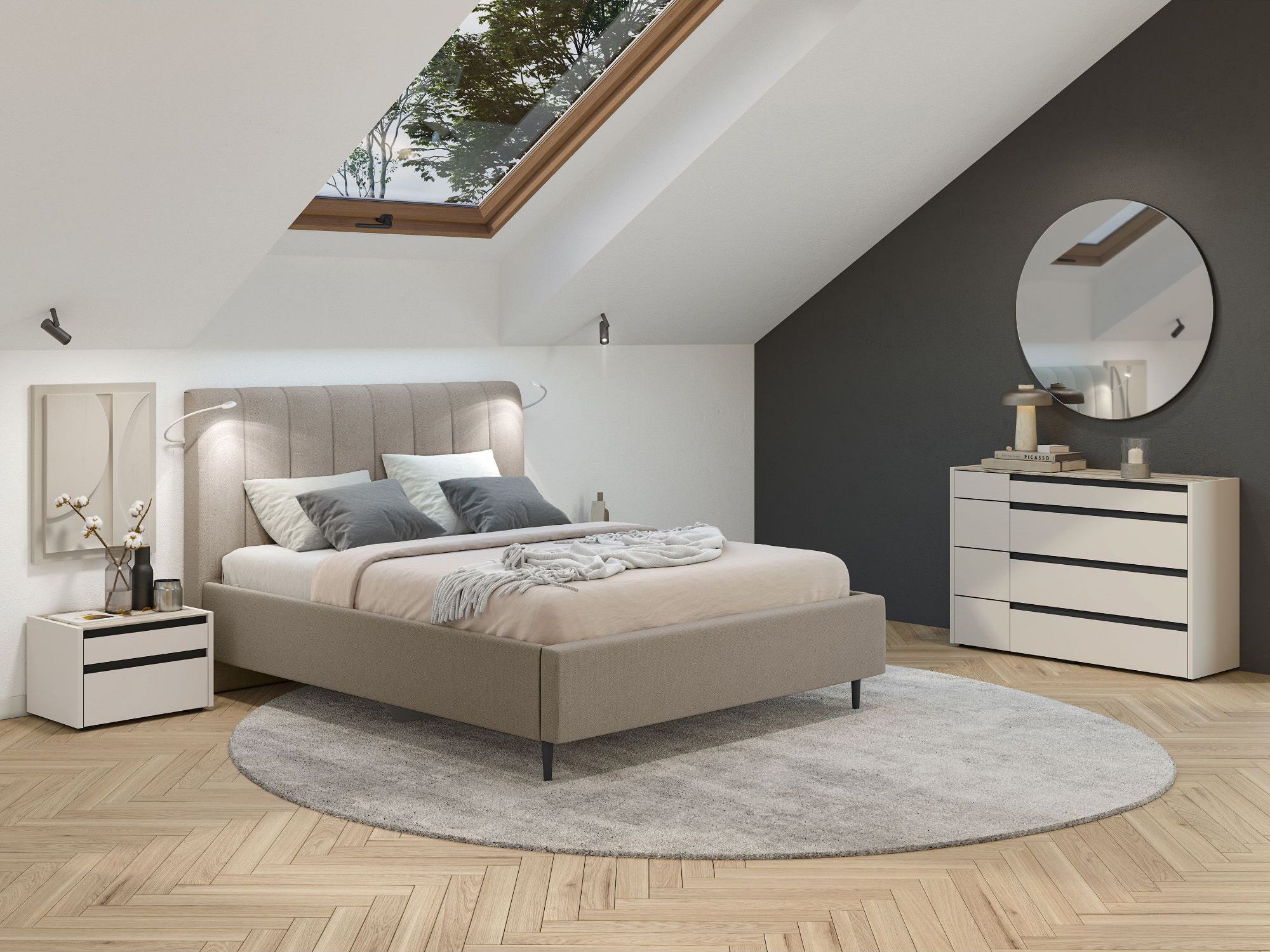 Оборотная сторона изголовья выполнена в обивочной ткани, что позволяет поставить кровать в центре комнаты и зонировать пространство.