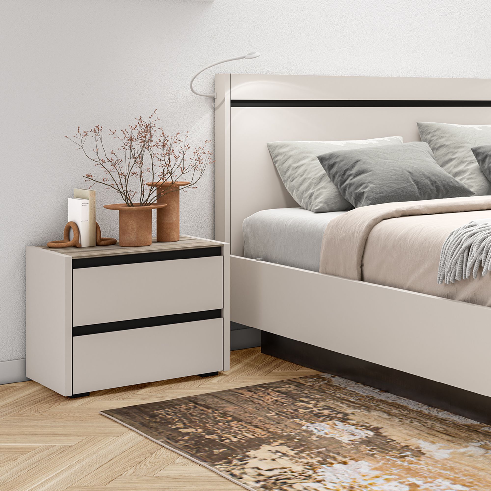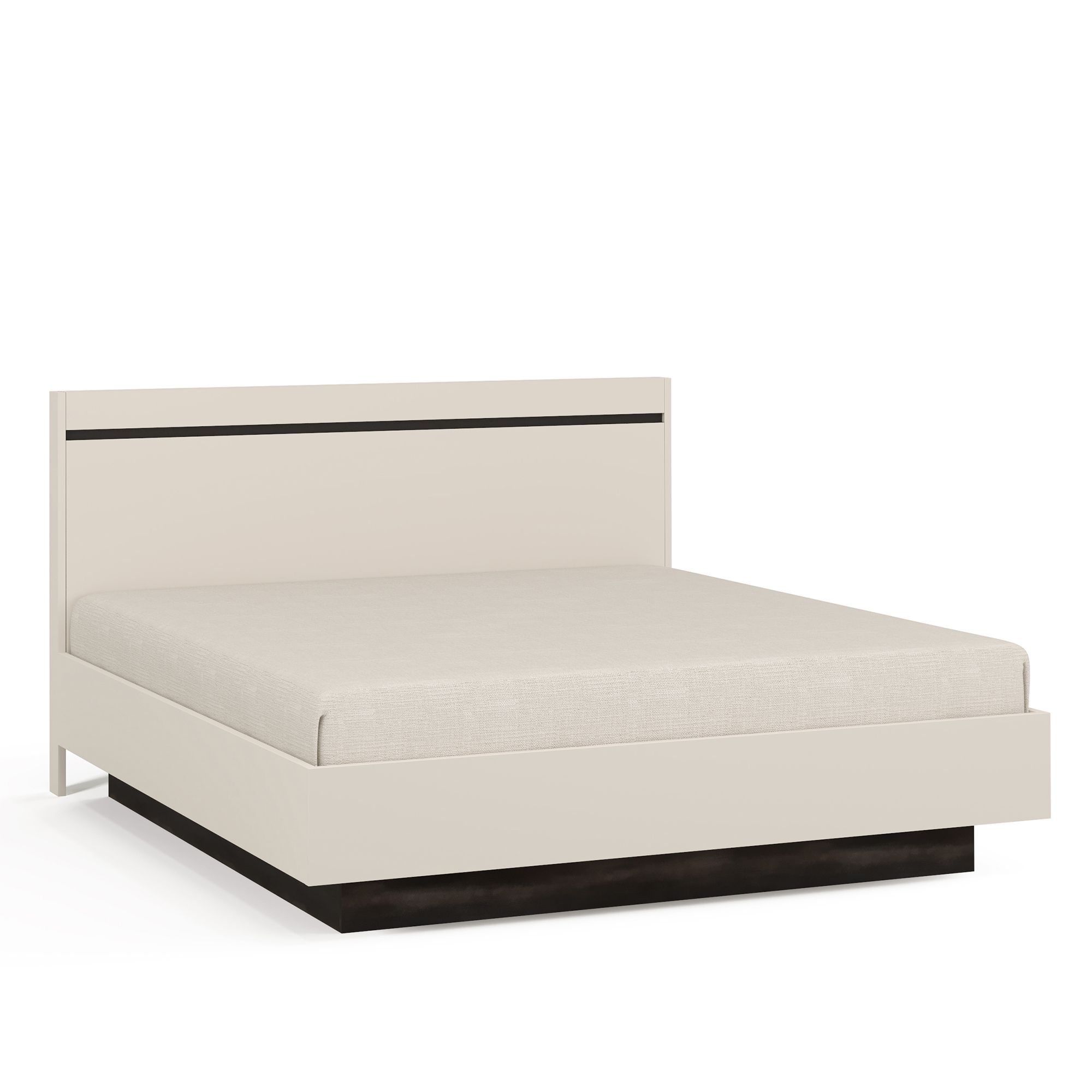 Изголовье кровати декорировано контрастной вставкой, отделка которой повторяет декор фасадов коллекции.