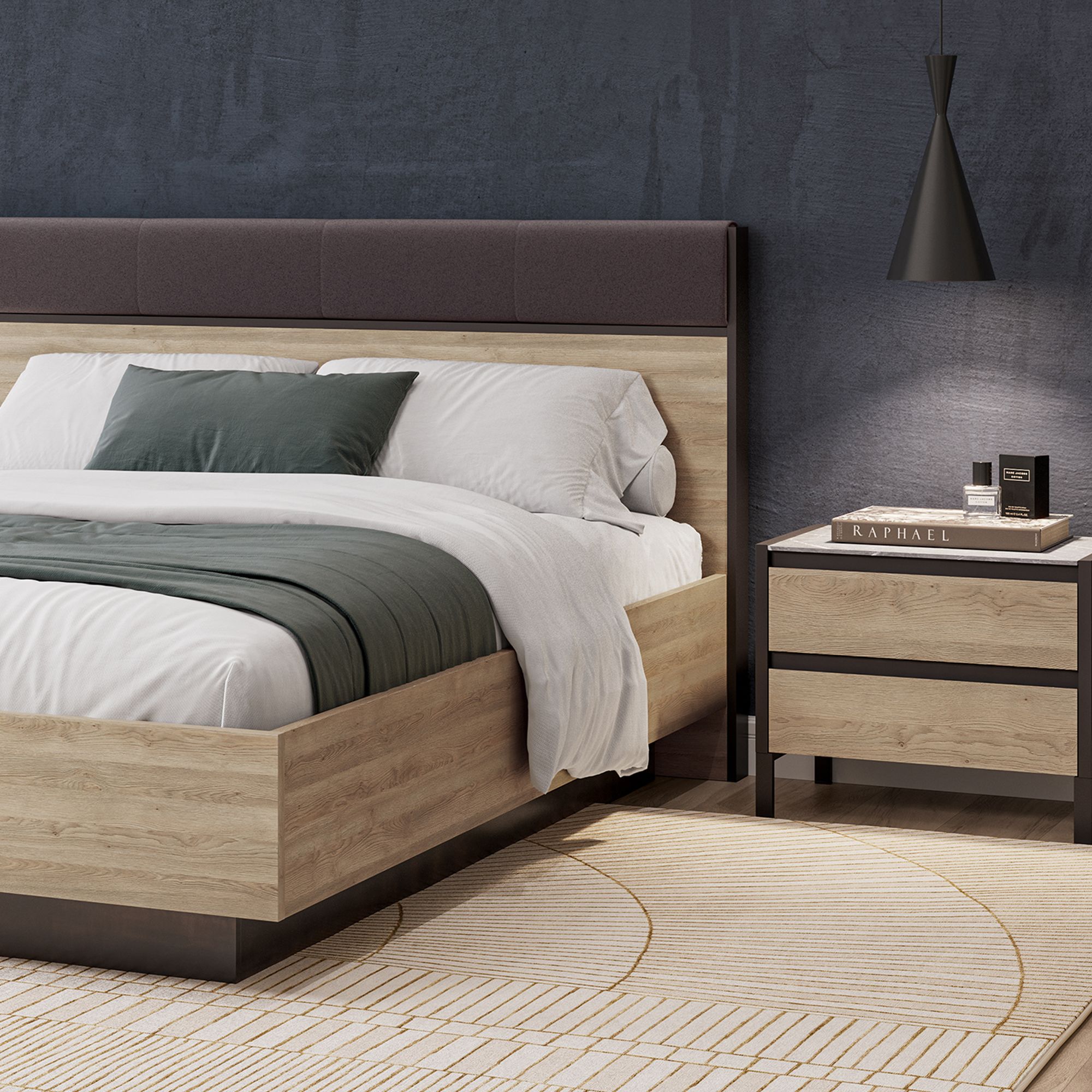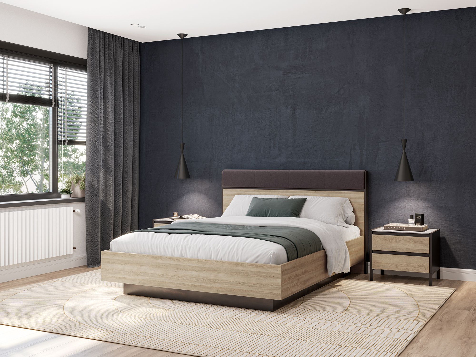 Полутораспальная кровать BRUNO выполнена в отделке матовой текстурой Дуб Гладстоун Серо-бежевый, которая в точности повторяет рельеф и природный рисунок натурального дерева. Головная спинка модели оснащена мягким элементом в оттенке STEEL GREY. Площадь вместительного бельевого ящика меньше спального места, что обеспечивает удобный подход с любой стороны. Ортопедическая решетка (каркас – металл) с подъемным механизмом включена в комплект. Оформление бельевого ящика текстурой Galaxy, рисунок которой напоминает темный металл, поддерживается контрастными элементами изголовья. Предусмотрена возможность оснащения изголовья системой подсветки (заказывается отдельно).