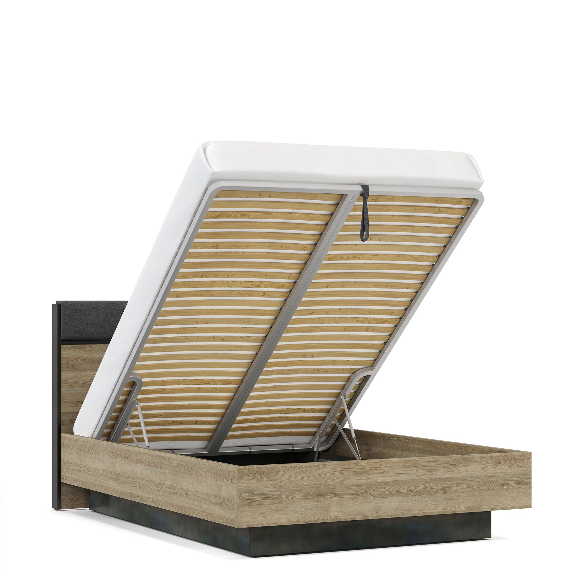 Дополнительное место для хранения создается за счет наличия у кроватей вместительного бельевого ящика, оснащенного надежным подъемным механизмом. Внешняя поверхность элемента выполнена в отделке текстурой Galaxy, а внутренняя – декором Шенилл, воспроизводящим рисунок плетения натуральной ткани.