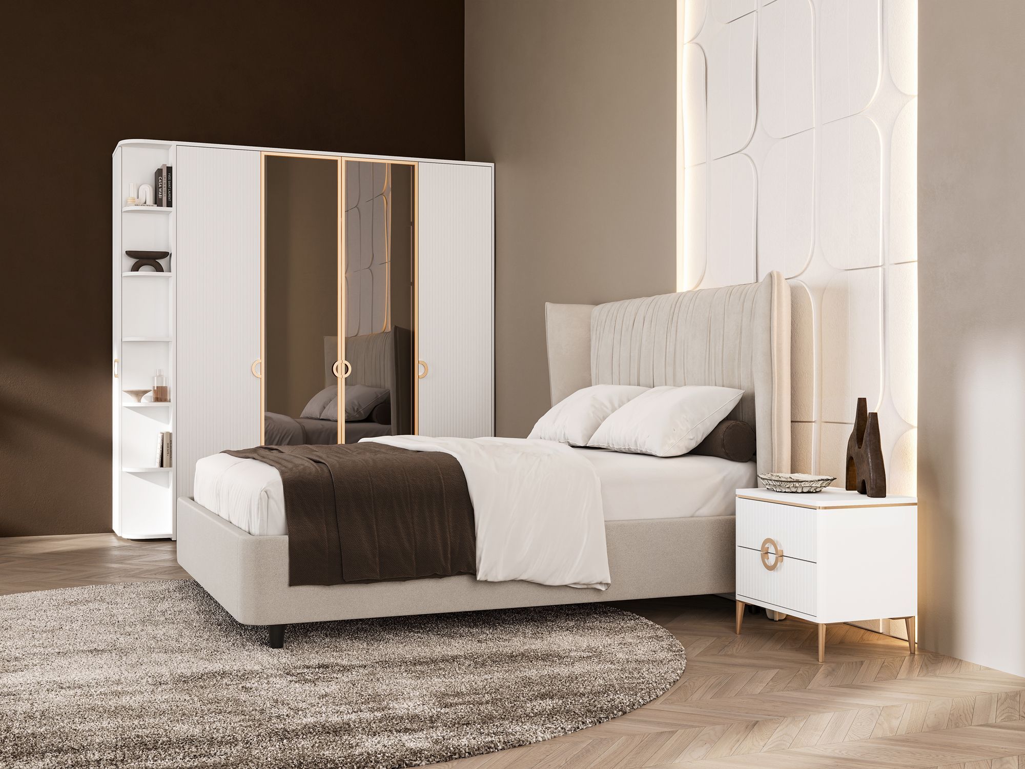 Благодаря мягкому наполнителю изголовья любители сериалов и чтения перед сном могут расположиться с комфортом. Строгая и лаконичная отделка в виде вертикальных утяжек визуально облегчает изголовье и делает его выше. Обивка кровати специально разработана по заказу бренда «Дятьково Design».