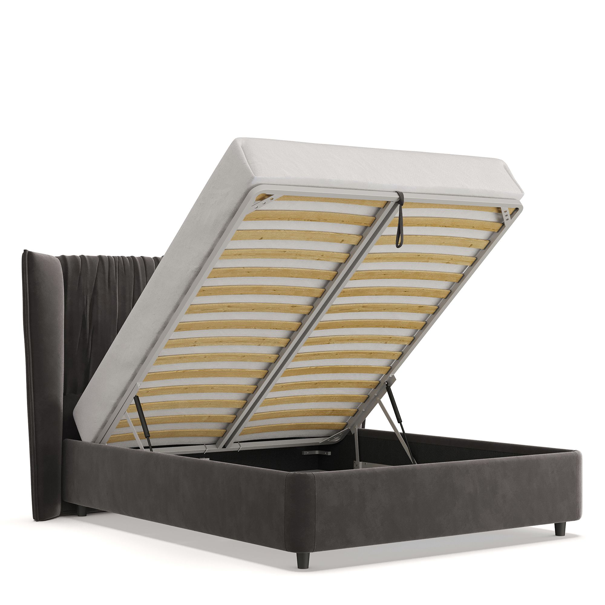 Вместительный короб внутри кровати подойдет для хранения подушек, белья и других вещей. В бельевом ящике нет перегородок – это позволяет использовать его, в том числе, для хранения длинных и крупногабаритных вещей.