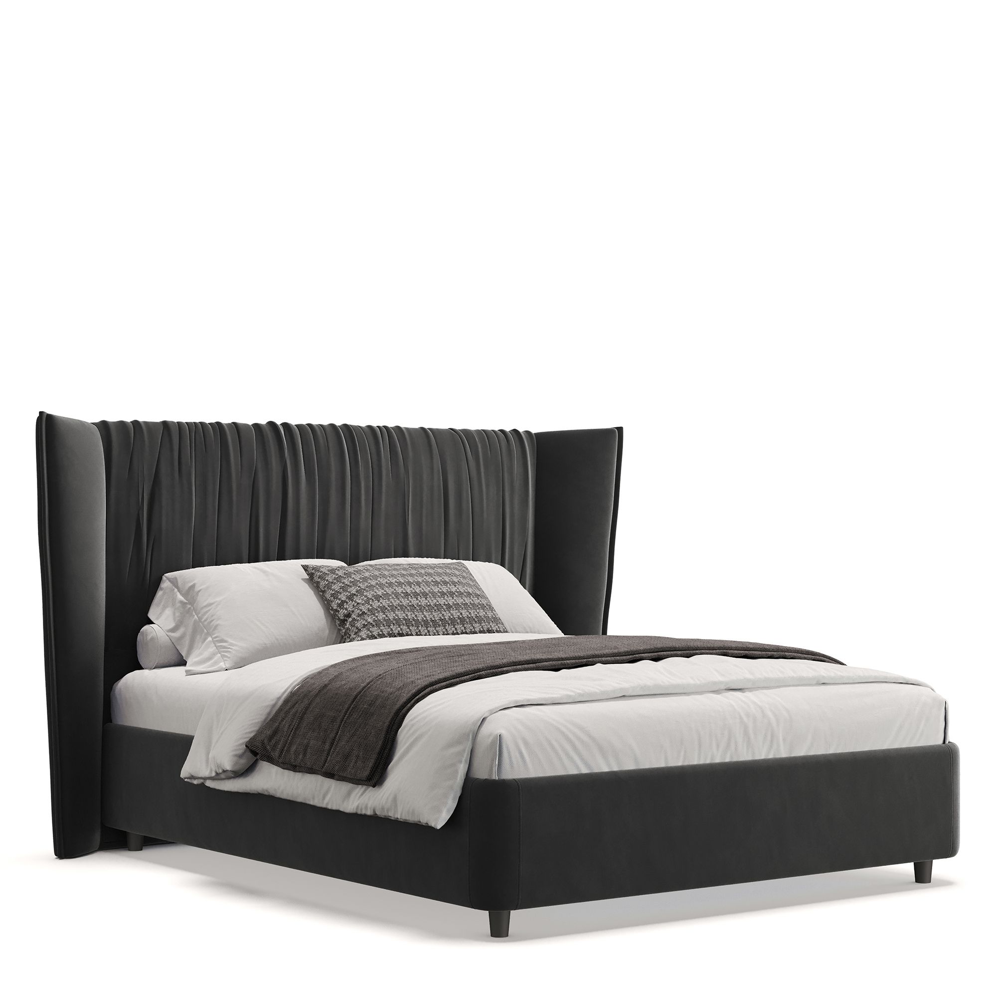 Кровать PLISSE в полностью мягком текстильном корпусе выполнена в отделке нежным микровелюром. Ее высокое драпированное изголовье словно «обнимает», образуя уютное пространство, защищенное от сквозняков. Скругленные углы кровати обеспечивают безопасность использования, а высокие ножки не создают препятствий при уборке с помощью робота-пылесоса. Модель оснащена надежным подъемным механизмом и вместительным ящиком для белья. Металлическое основание и ортопедическая решетка (каркас – металл) входят в комплектацию.