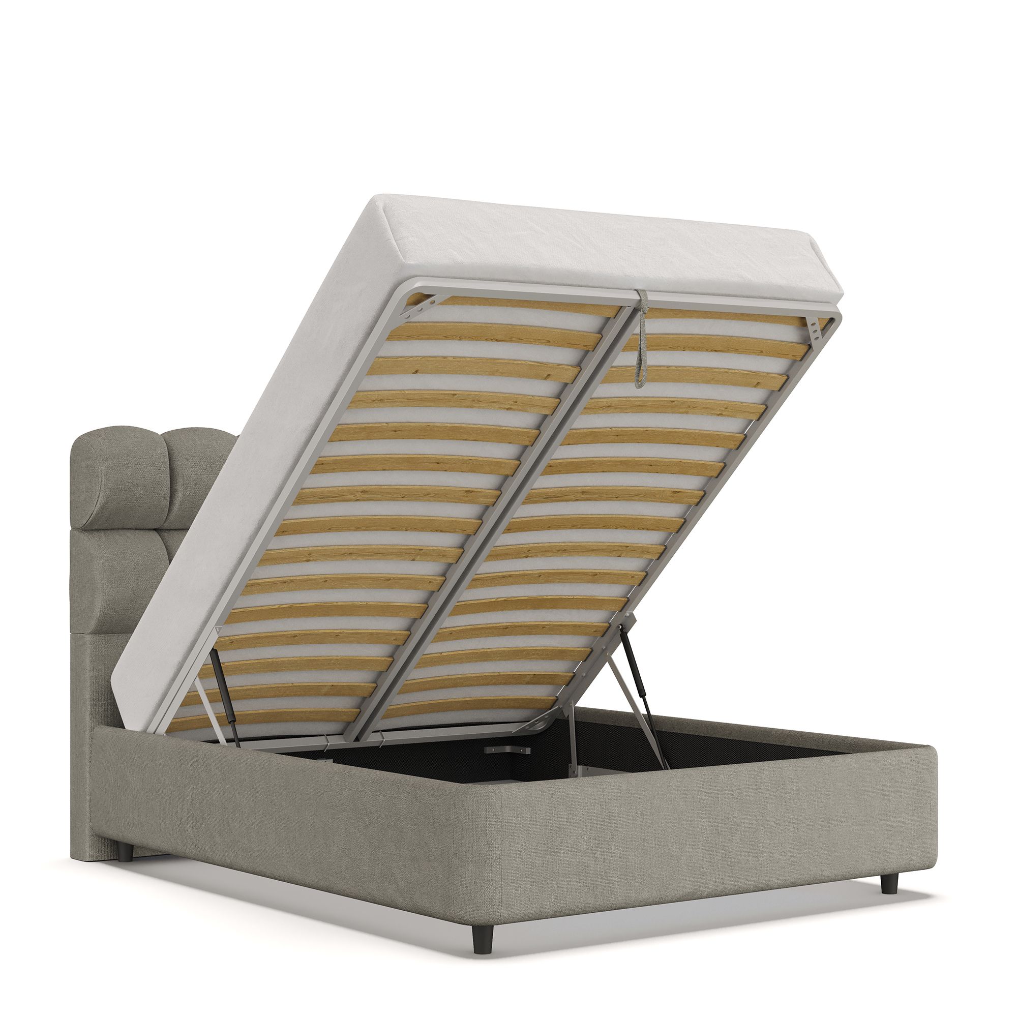 Механизм на газовых лифтах надежен и безопасен. Он плавно и бесшумно поднимает матрас, позволяя открывать ящик без особых усилий. Нагрузка на подъемный механизм – до 120 кг. Можно использовать матрас высотой до 32 см.