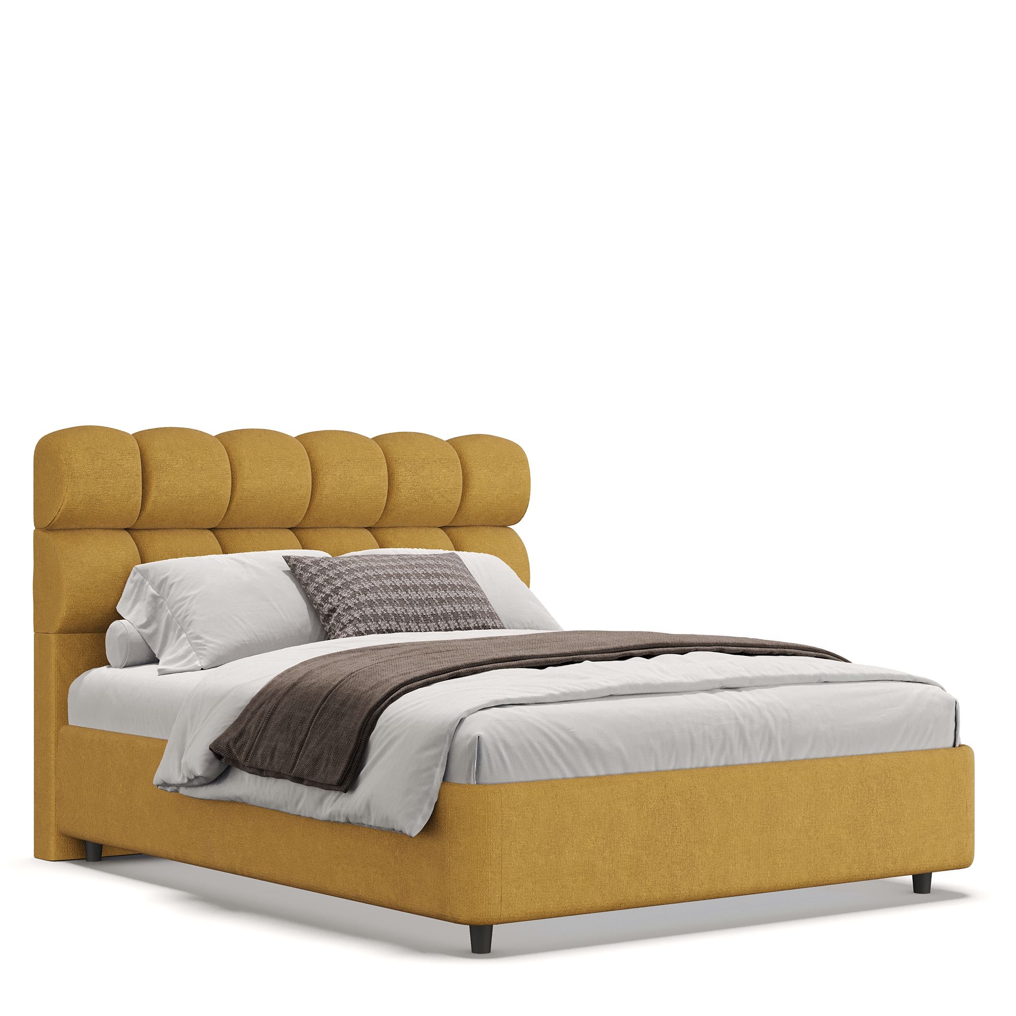 Благодаря мягкому наполнителю изголовья любители чтения перед сном и сериалов могут расположиться с комфортом. Пышная отделка в виде выпуклых роликов делает изголовье невероятно мягким и комфортным. Обивка кровати специально разработана по заказу бренда «Дятьково Design».