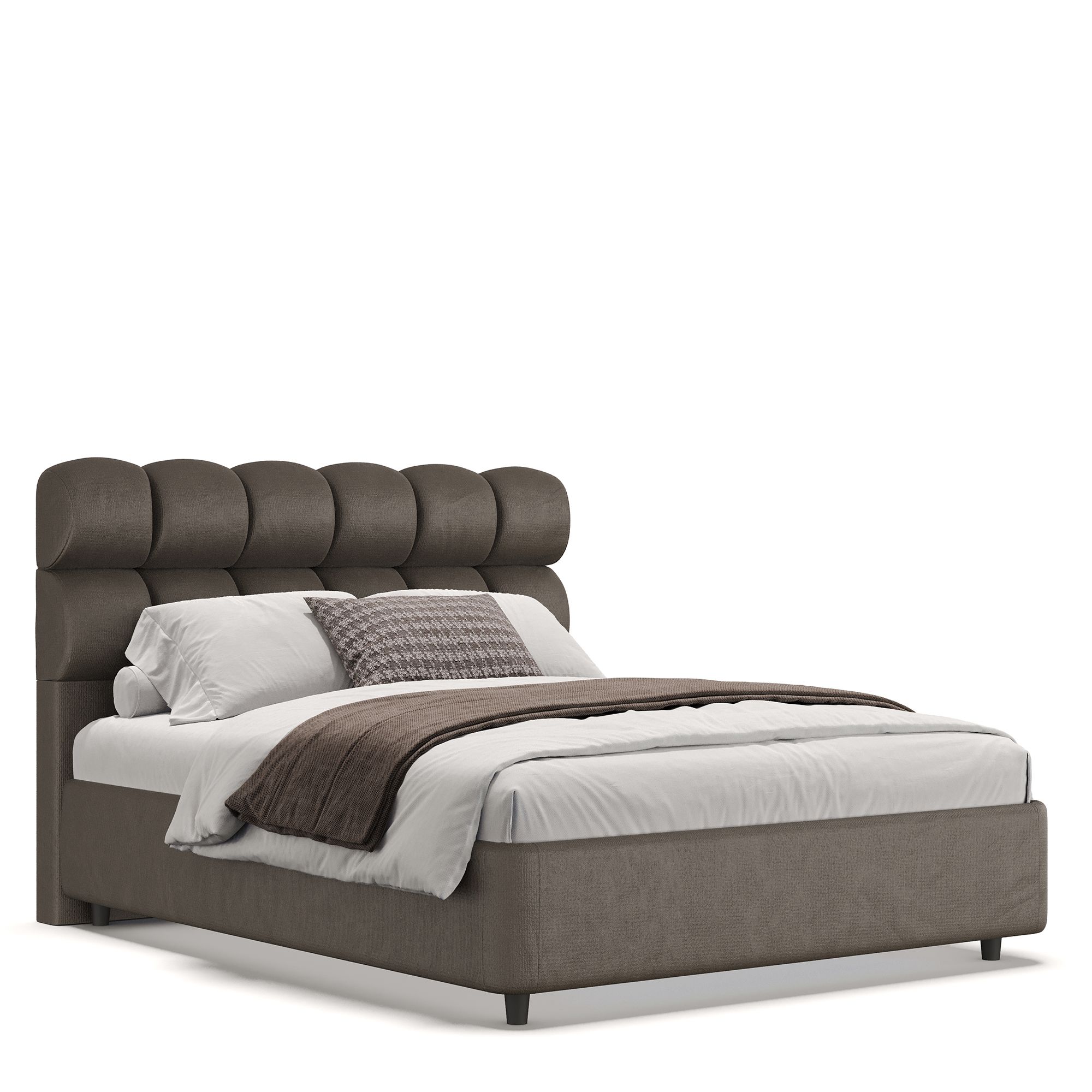 Благодаря мягкому наполнителю изголовья любители чтения перед сном и сериалов могут расположиться с комфортом. Пышная отделка в виде выпуклых роликов делает изголовье невероятно мягким и комфортным. Обивка кровати специально разработана по заказу бренда «Дятьково Design».