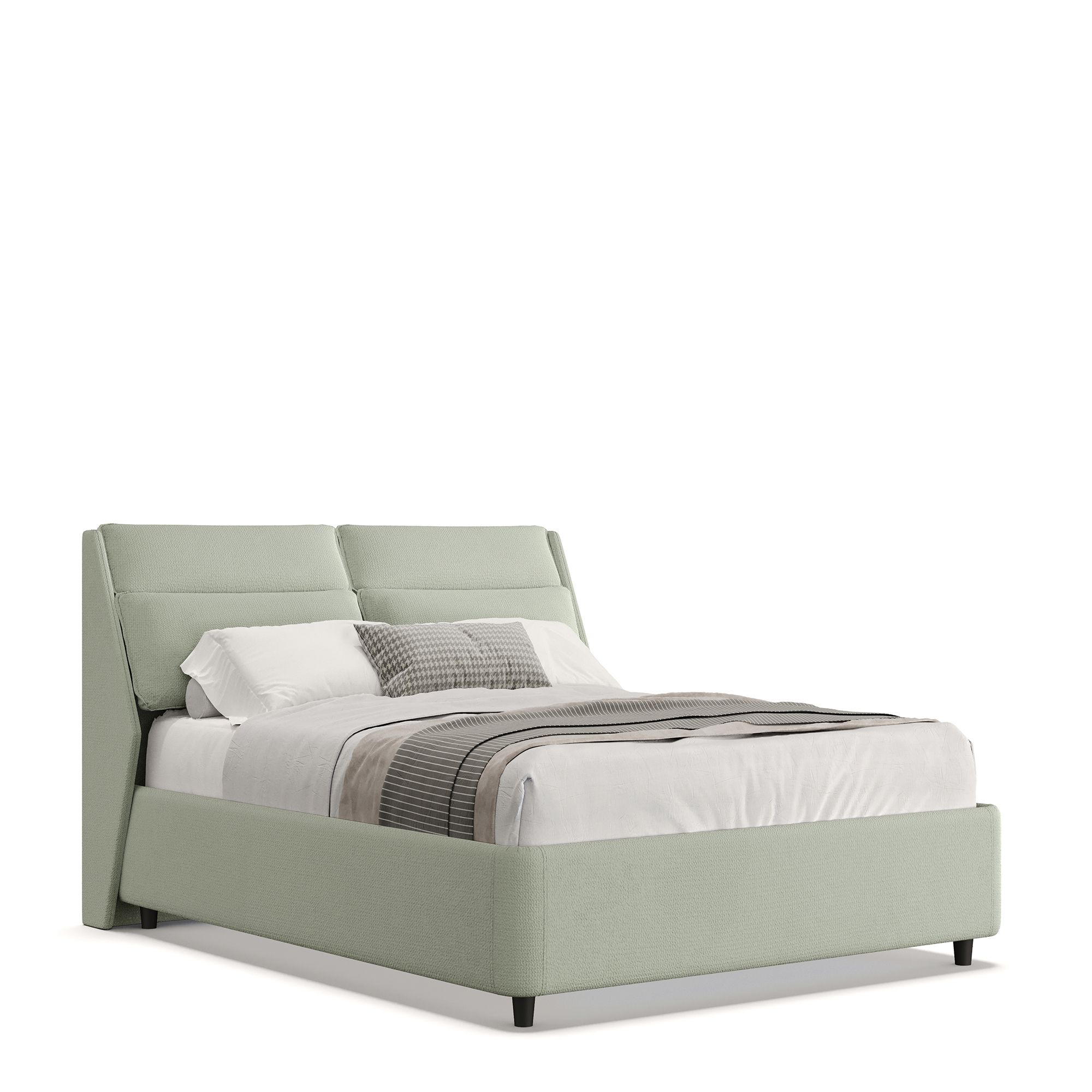 Полутораспальная кровать TEWIN выполнена в полностью мягком текстильном корпусе из рогожки, а ее изголовье оснащено необычными подушками, расположенными под углом, чтобы на них было удобно облокотиться, отдыхая за чтением или просмотром сериала. Скругленные углы основания обеспечивают безопасность использования, а дизайн с высокими ножными опорами не создает препятствий при уборке с помощью робота-пылесоса. Модель оснащена надежным подъемным механизмом и вместительным ящиком для белья. Металлическое основание и ортопедическая решетка (каркас – металл) входят в комплектацию.