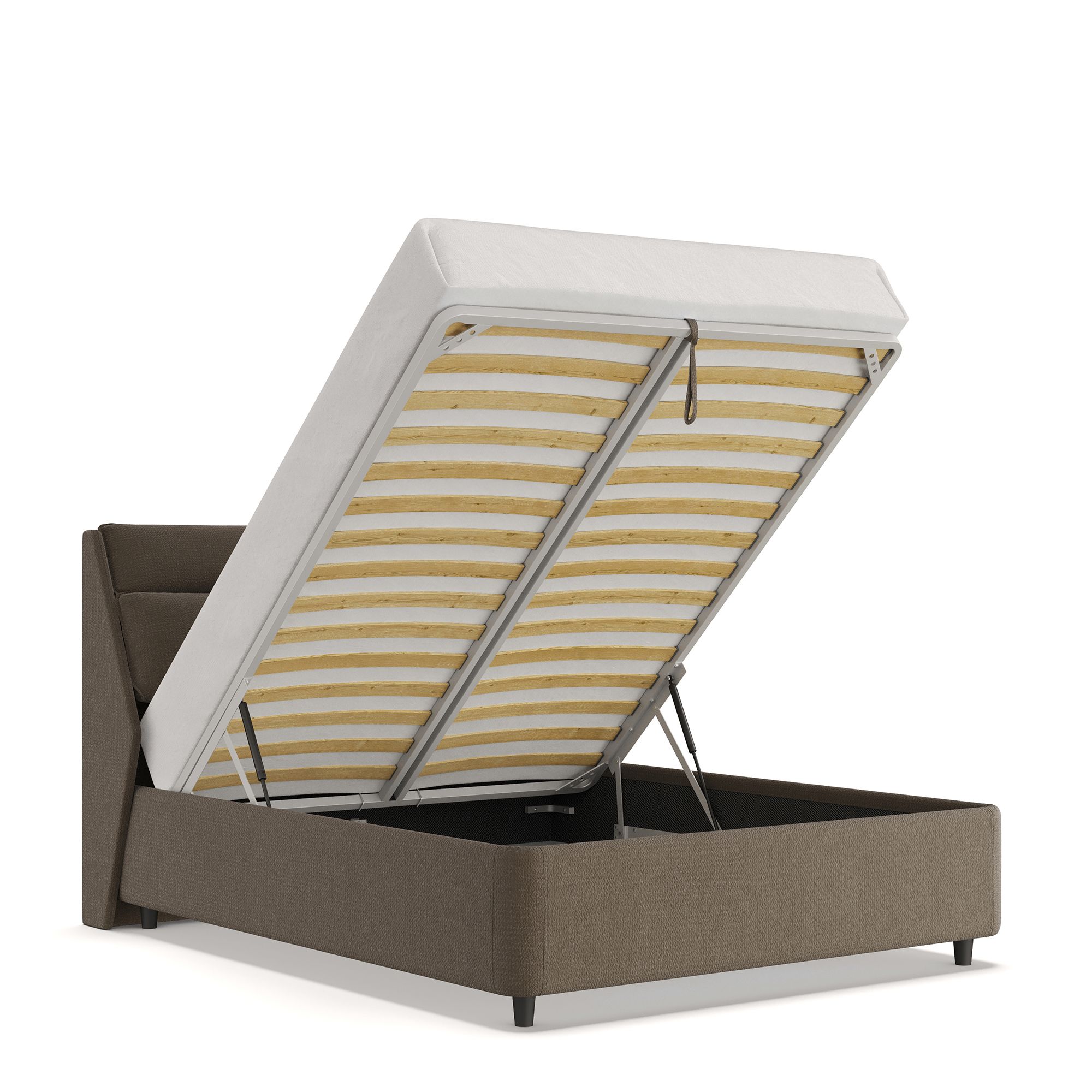 Механизм на газовых лифтах надежен и безопасен. Он плавно и бесшумно поднимает матрас, позволяя открывать ящик без особых усилий. Нагрузка на подъемный механизм – до 120 кг. Можно использовать матрас высотой до 32 см.