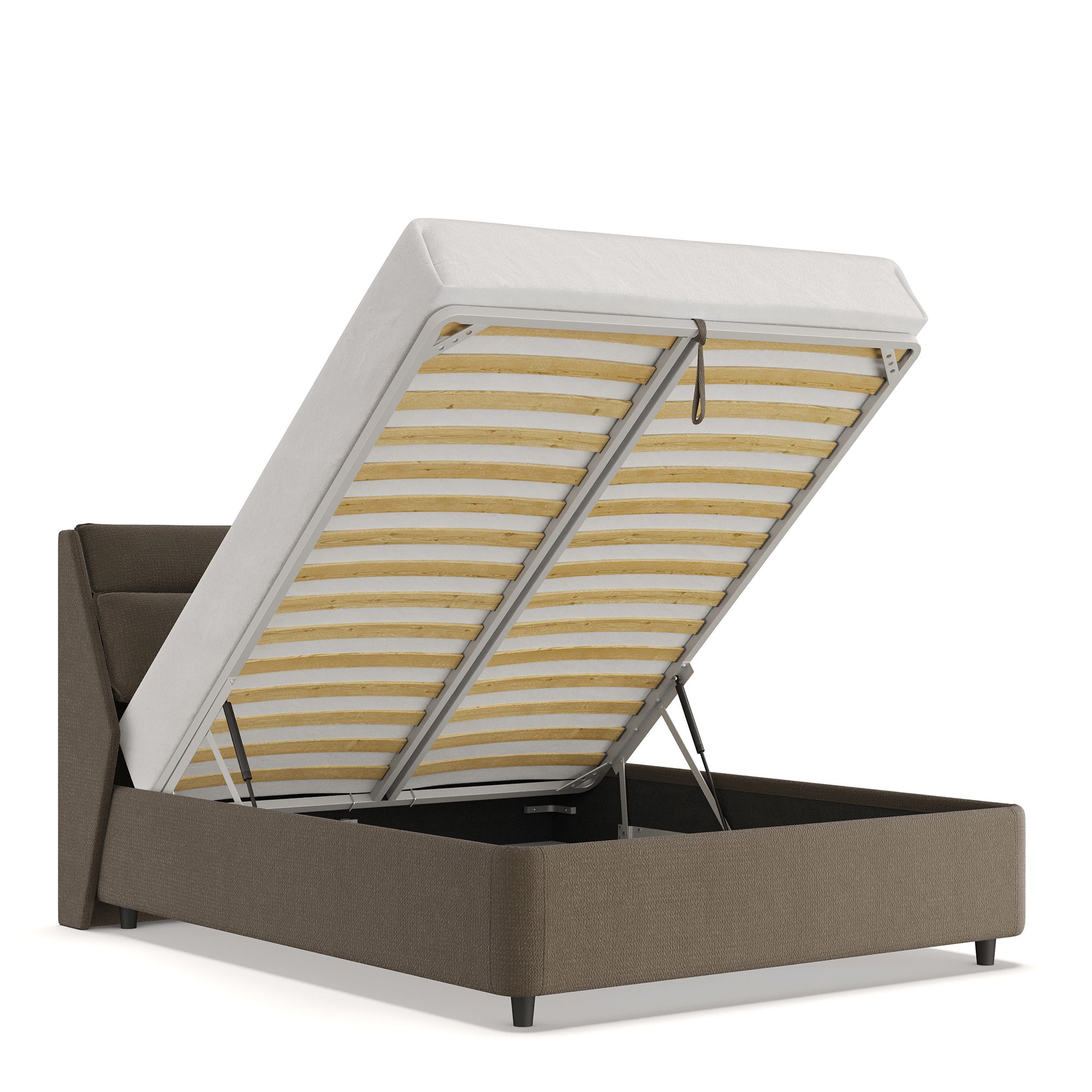 Полутораспальная кровать TEWIN выполнена в полностью мягком текстильном корпусе из рогожки, а ее изголовье оснащено необычными подушками, расположенными под углом, чтобы на них было удобно облокотиться, отдыхая за чтением или просмотром сериала. Скругленные углы основания обеспечивают безопасность использования, а дизайн с высокими ножными опорами не создает препятствий при уборке с помощью робота-пылесоса. Модель оснащена надежным подъемным механизмом и вместительным ящиком для белья. Металлическое основание и ортопедическая решетка (каркас – металл) входят в комплектацию.